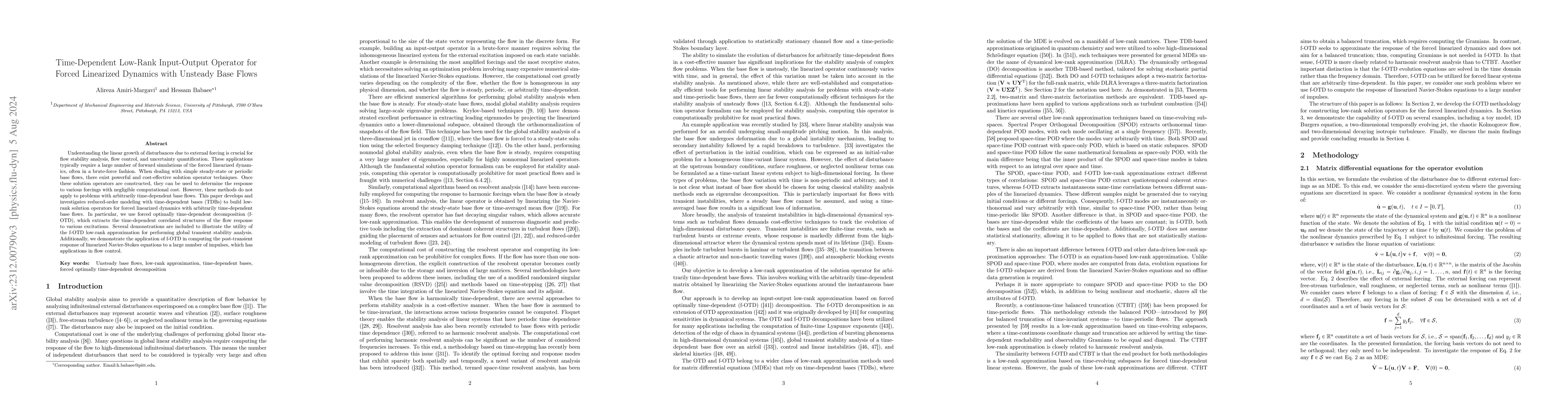 This paper develops a low-rank solution operator for analyzing the linear growth of disturbances in forced linearized dynamics with unsteady base flows. It introduces forced optimally time-dependent decomposition (f-OTD) to extract time-dependent correlated structures, demonstrating its effectiveness in four cases to identify maximum amplification and reconstruct full-state flow without additional computational costs.