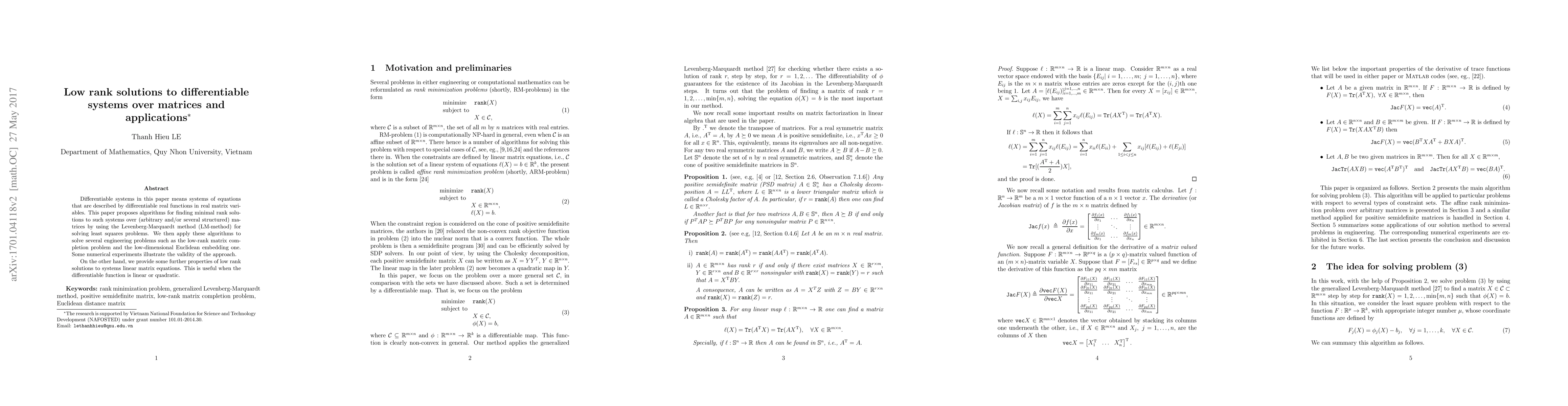 This paper proposes algorithms using the Levenberg-Marquardt method to find minimal rank solutions for differentiable systems over matrices, and applies these to solve engineering problems like low-rank matrix completion and low-dimensional Euclidean embedding, demonstrating their effectiveness through numerical experiments. It also explores properties of low rank solutions for linear matrix equations.