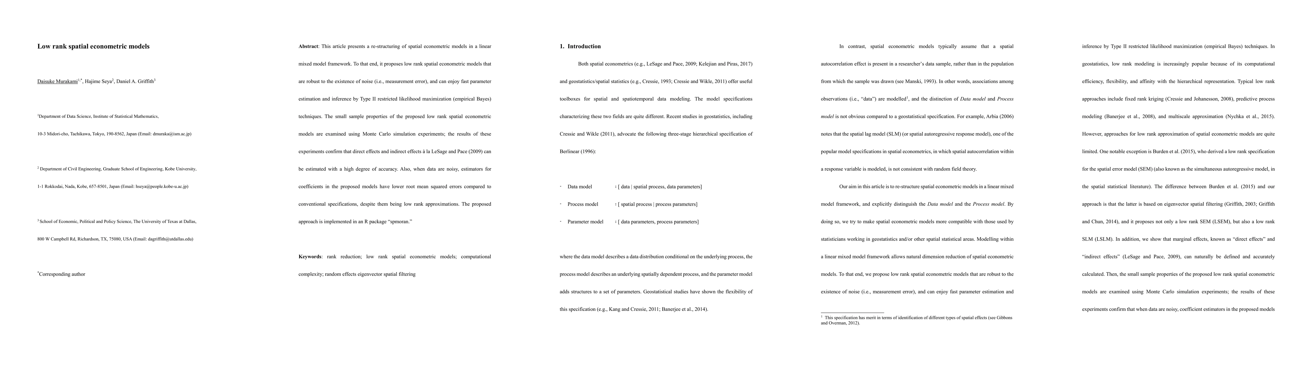 This paper introduces a low rank spatial econometric model framework within a linear mixed model, offering robust estimation and inference techniques. Monte Carlo simulations demonstrate high accuracy in estimating direct and indirect effects, and lower root mean squared errors in noisy data compared to conventional models.