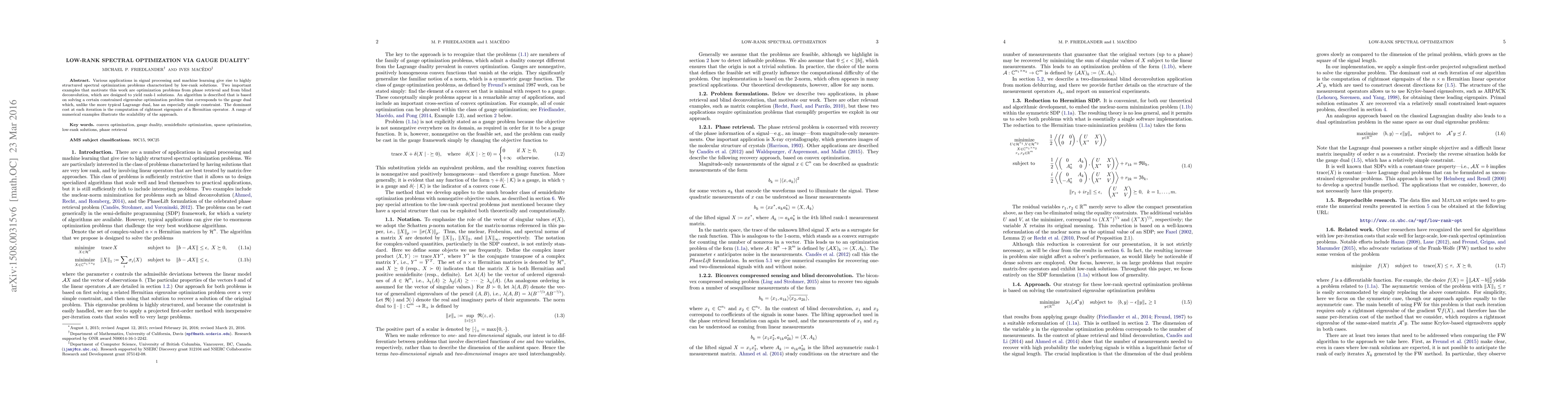 Various applications in signal processing and machine learning give rise to highly structured spectral optimization problems characterized by low-rank solutions. Two important examples that motivate this work are optimization problems from phase retrieval and from blind deconvolution, which are designed to yield rank-1 solutions. An algorithm is described that is based on solving a certain constrained eigenvalue optimization problem that corresponds to the gauge dual which, unlike the more typical Lagrange dual, has an especially simple constraint. The dominant cost at each iteration is the computation of rightmost eigenpairs of a Hermitian operator. A range of numerical examples illustrate the scalability of the approach.