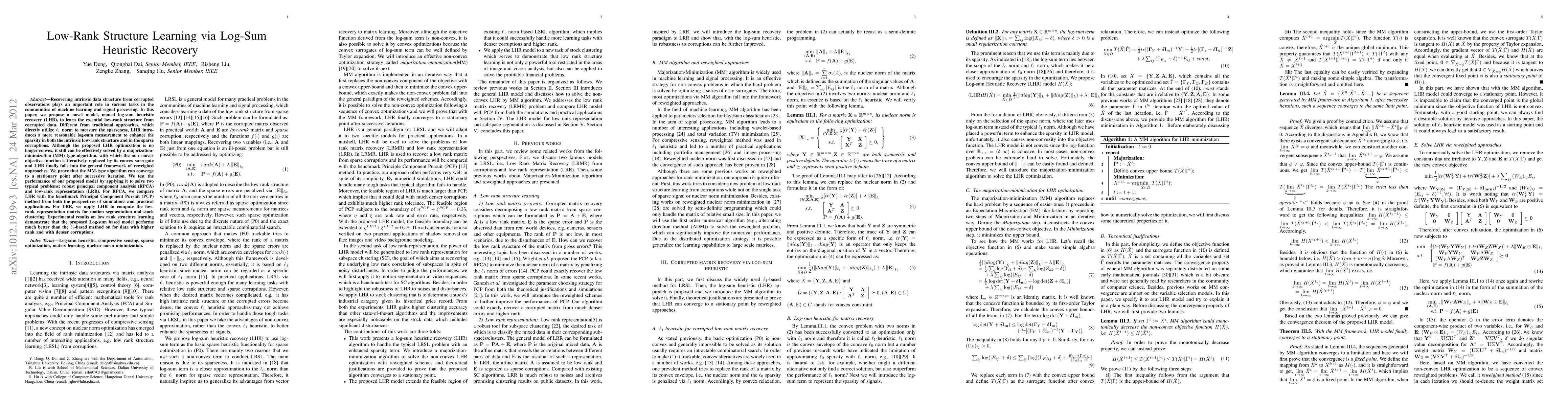 This research introduces the Log-Sum Heuristic Recovery (LHR) model for learning low-rank data structures from corrupted observations. Unlike traditional methods, LHR uses a log-sum measurement to improve sparsity in both the underlying low-rank structure and the sparse corruptions. The non-convex LHR optimization is solved via a majorization-minimization algorithm, proven to converge to a stationary point. Experiments show that LHR outperforms $ell_1$-based methods, especially for data with higher rank and denser corruptions, in applications like RPCA and LRR for motion segmentation and stock clustering.