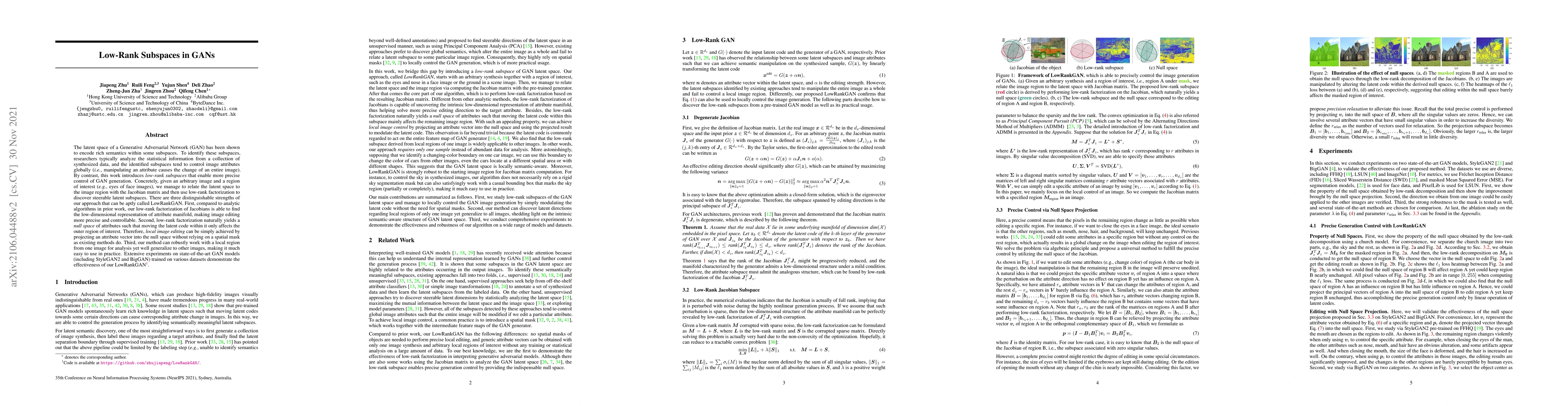 This paper introduces LowRankGAN, a method to identify low-rank subspaces in GANs that enable precise local image editing. By using low-rank factorization of Jacobians, it discovers steerable latent subspaces that allow for more controlled manipulation of specific image regions without affecting the entire image.