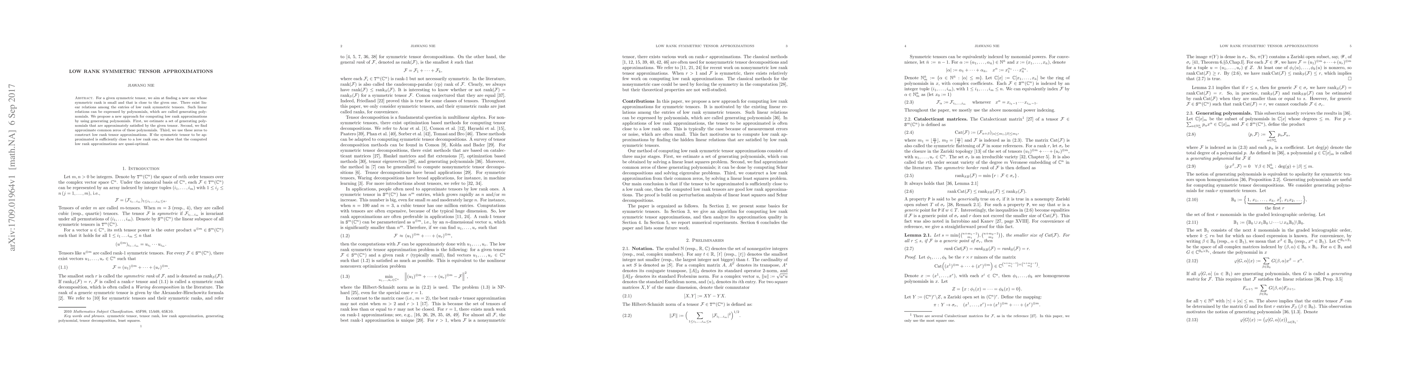 This paper proposes a novel method for approximating low rank symmetric tensors using generating polynomials. The approach estimates these polynomials, identifies their common zeros, and constructs tensor approximations based on these zeros, demonstrating quasi-optimality when the original tensor is close to being low rank.