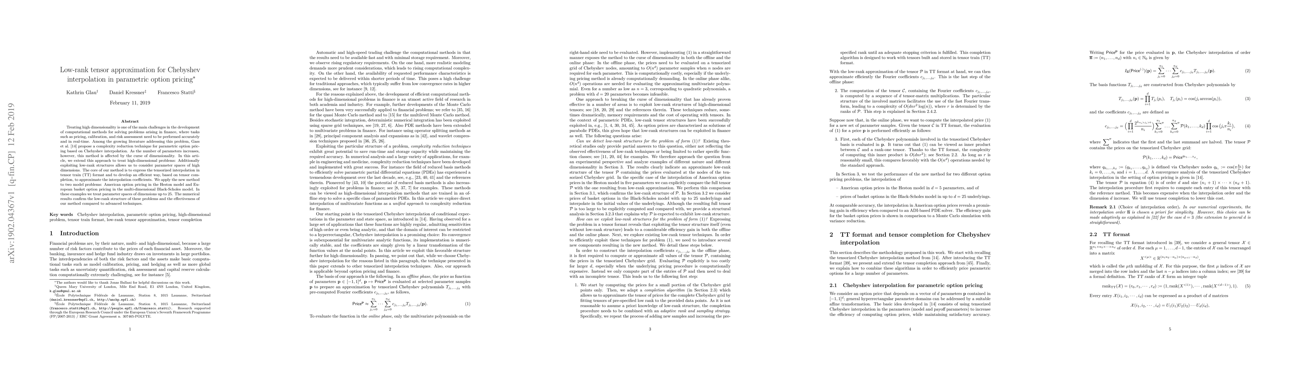 This paper proposes a low-rank tensor approximation technique to enhance Chebyshev interpolation for high-dimensional parametric option pricing, addressing the curse of dimensionality. The method utilizes tensor train format and tensor completion to efficiently approximate interpolation coefficients, successfully applied to American and European basket option pricing.