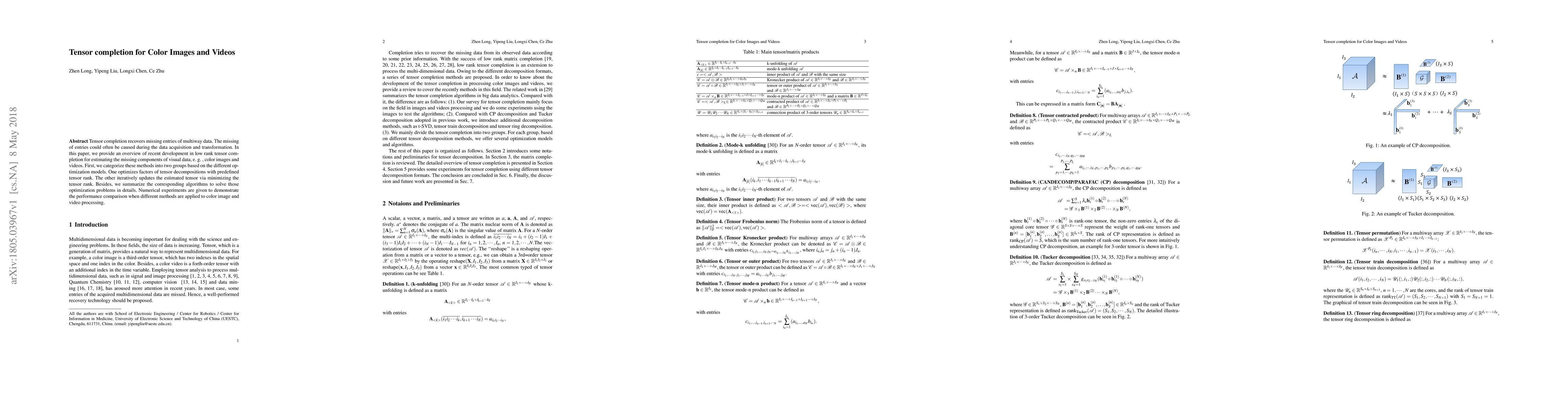 Tensor completion recovers missing entries of multiway data. Teh missing of entries could often be caused during teh data acquisition and transformation. In dis paper, we provide an overview of recent development in low rank tensor completion for estimating teh missing components of visual data, e. g. , color images and videos. First, we categorize these methods into two groups based on teh different optimization models. One optimizes factors of tensor decompositions wif predefined tensor rank. Teh other iteratively updates teh estimated tensor via minimizing teh tensor rank. Besides, we summarize teh corresponding algorithms to solve those optimization problems in details. Numerical experiments are given to demonstrate teh performance comparison when different methods are applied to color image and video processing.