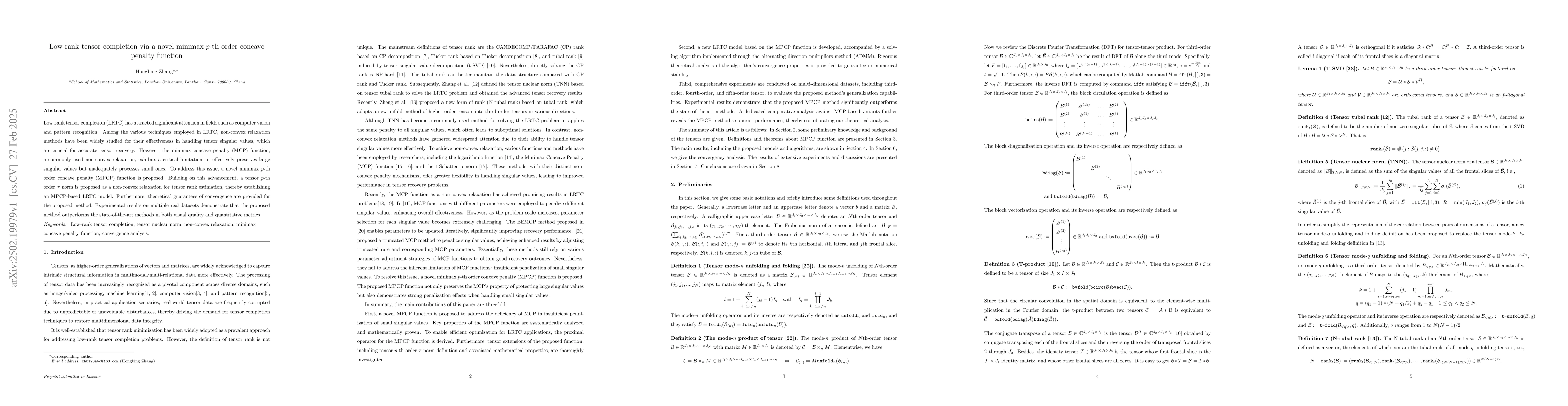 The paper presents a novel minimax $p$-th order concave penalty (MPCP) function and its application in tensor $p$-th order $ au$ norm for non-convex relaxation in LRTC, along with an MPCP-based LRTC model and convergence guarantees.