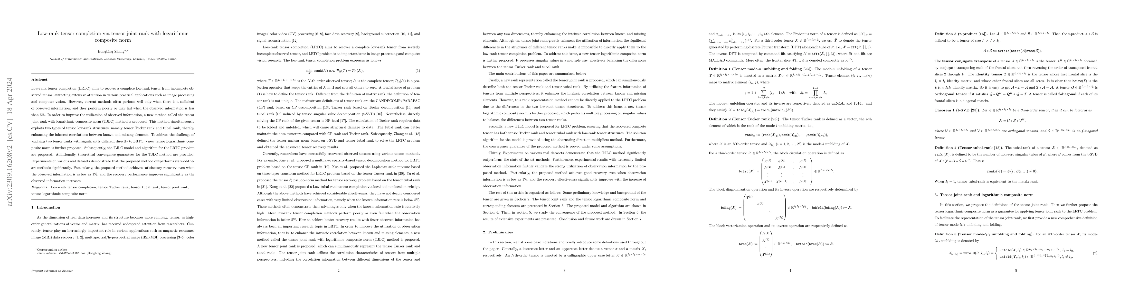 The paper introduces a novel tensor joint rank with logarithmic composite norm (TJLC) method for low-rank tensor completion (LRTC), combining tensor Tucker rank and tubal rank to better utilize sparse observed data. It provides theoretical convergence guarantees and outperforms existing methods, especially when only 1% of data is observed.
