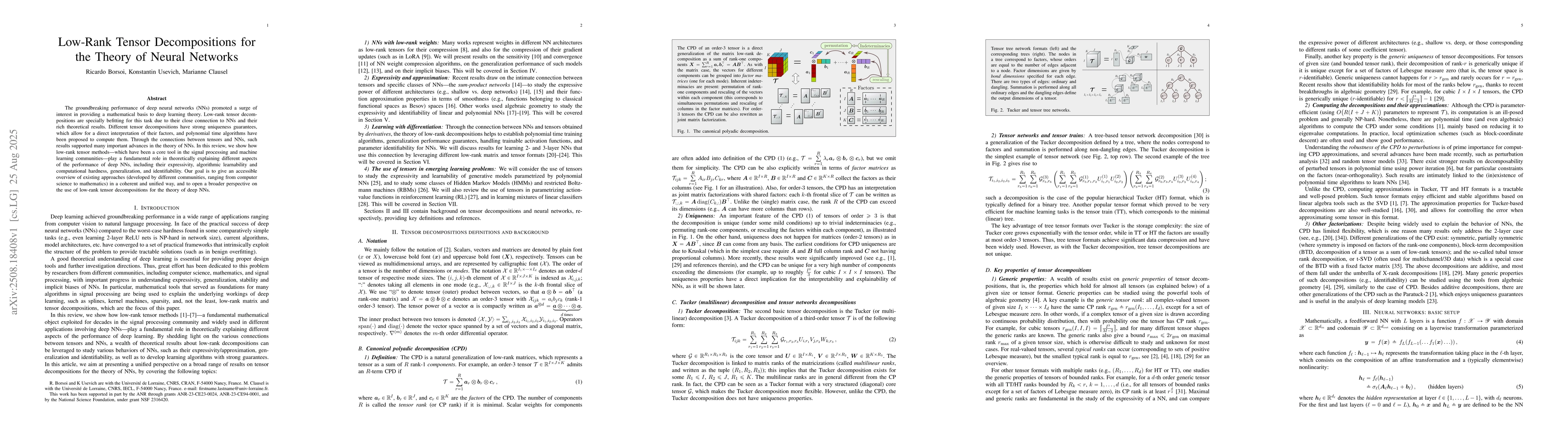 The groundbreaking performance of deep neural networks (NNs) promoted a surge of interest in providing a mathematical basis to deep learning theory. Low-rank tensor decompositions are specially befitting for this task due to their close connection to NNs and their rich theoretical results. Different tensor decompositions have strong uniqueness guarantees, which allow for a direct interpretation of their factors, and polynomial time algorithms have been proposed to compute them. Through the connections between tensors and NNs, such results supported many important advances in the theory of NNs. In this review, we show how low-rank tensor methods--which have been a core tool in the signal processing and machine learning communities--play a fundamental role in theoretically explaining different aspects of the performance of deep NNs, including their expressivity, algorithmic learnability and computational hardness, generalization, and identifiability. Our goal is to give an accessible overview of existing approaches (developed by different communities, ranging from computer science to mathematics) in a coherent and unified way, and to open a broader perspective on the use of low-rank tensor decompositions for the theory of deep NNs.