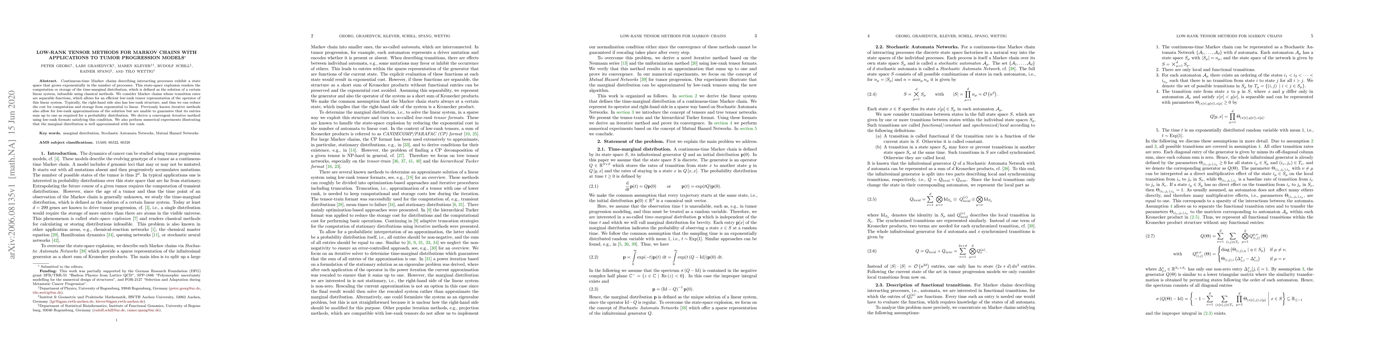 This paper proposes low-rank tensor methods to efficiently compute the time-marginal distribution for Markov chains with separable transition rates, addressing the state-space explosion problem. The method guarantees a probability distribution sum of one and demonstrates effective approximation through numerical experiments on tumor progression models.
