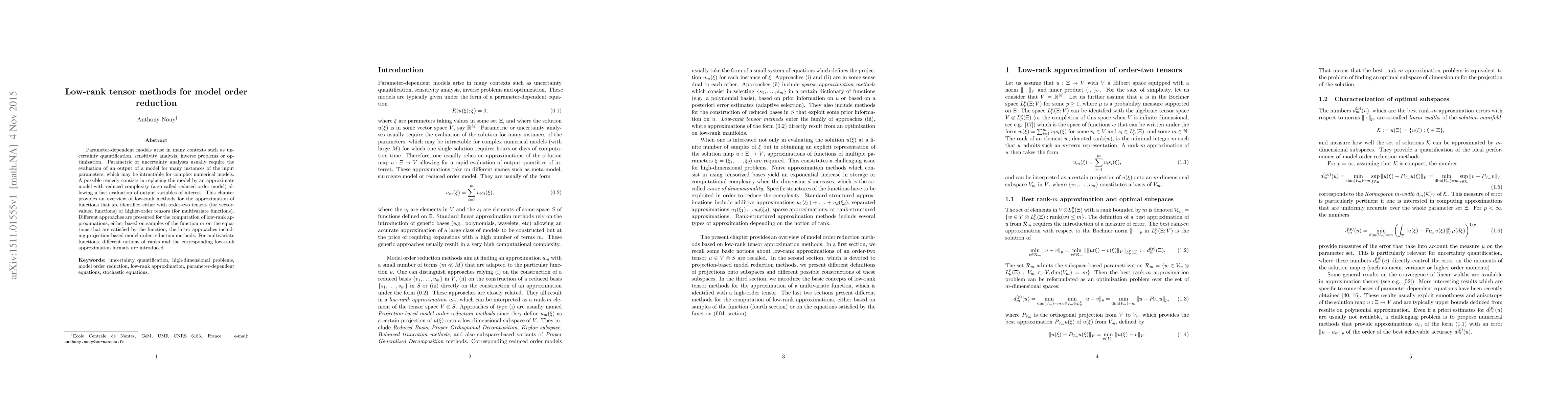 This paper reviews low-rank tensor methods for reducing the complexity of parameter-dependent models, focusing on both vector-valued and multivariate functions. It discusses various approaches for computing low-rank approximations, including projection-based methods for multivariate functions.