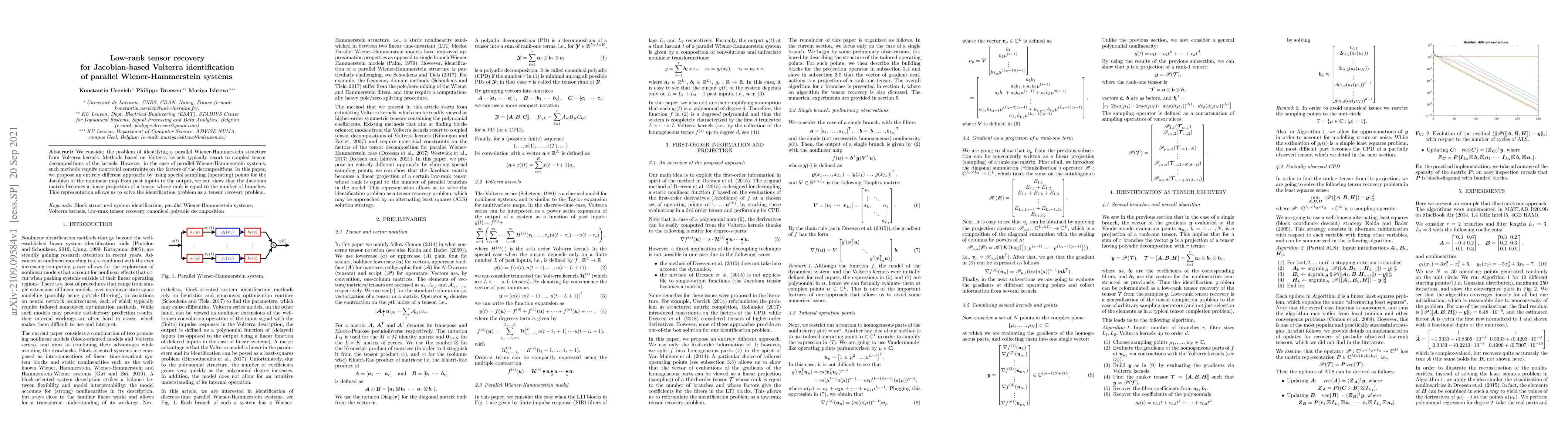 This paper proposes a novel low-rank tensor recovery method for identifying parallel Wiener-Hammerstein systems using Jacobian-based Volterra identification. Instead of traditional tensor decompositions, it leverages special sampling points to represent the Jacobian as a linear projection of a tensor, simplifying the identification problem.