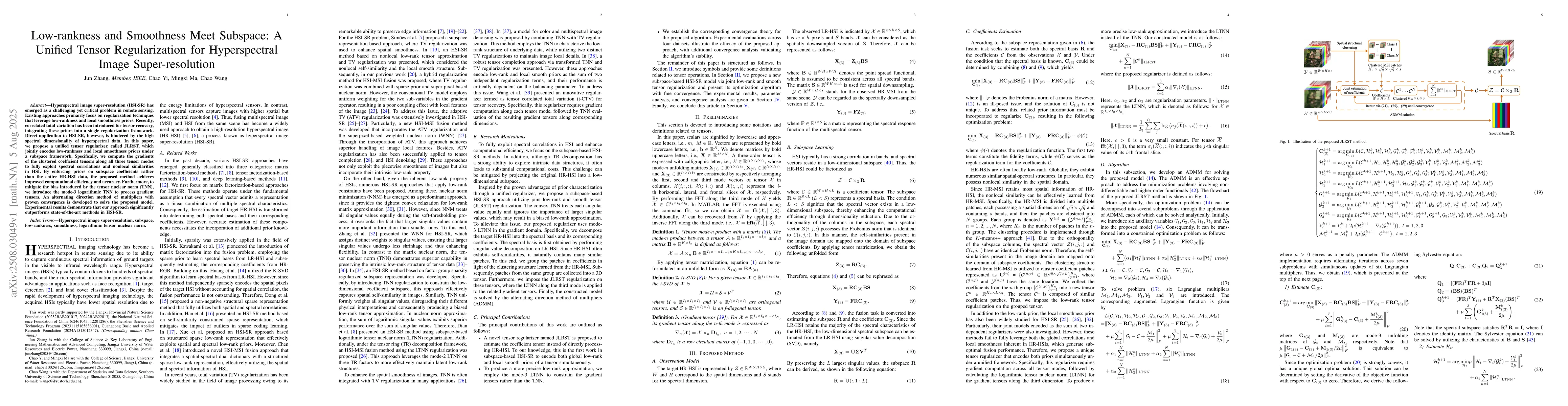 Hyperspectral image super-resolution (HSI-SR) has emerged as a challenging yet critical problem in remote sensing. Existing approaches primarily focus on regularization techniques that leverage low-rankness and local smoothness priors. Recently, correlated total variation has been introduced for tensor recovery, integrating these priors into a single regularization framework. Direct application to HSI-SR, however, is hindered by the high spectral dimensionality of hyperspectral data. In this paper, we propose a unified tensor regularizer, called JLRST, which jointly encodes low-rankness and local smoothness priors under a subspace framework. Specifically, we compute the gradients of the clustered coefficient tensors along all three tensor modes to fully exploit spectral correlations and nonlocal similarities in HSI. By enforcing priors on subspace coefficients rather than the entire HR-HSI data, the proposed method achieves improved computational efficiency and accuracy. Furthermore, to mitigate the bias introduced by the tensor nuclear norm (TNN), we introduce the mode-3 logarithmic TNN to process gradient tensors. An alternating direction method of multipliers with proven convergence is developed to solve the proposed model. Experimental results demonstrate that our approach significantly outperforms state-of-the-art methods in HSI-SR.