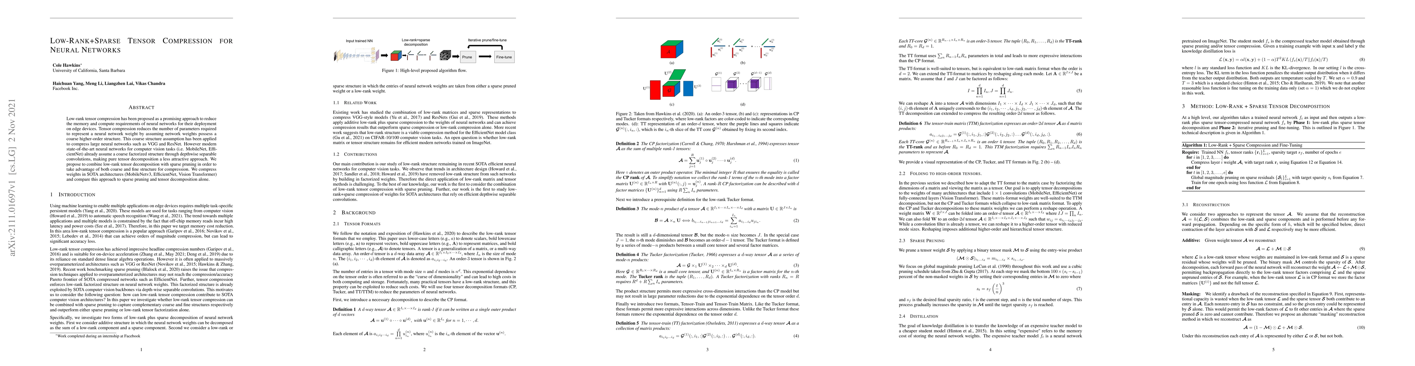This paper proposes a hybrid method combining low-rank tensor compression with sparse pruning to compress state-of-the-art neural networks like MobileNetv3, EfficientNet, and Vision Transformer. It outperforms sparse pruning and tensor decomposition alone by leveraging both coarse and fine network weight structures.