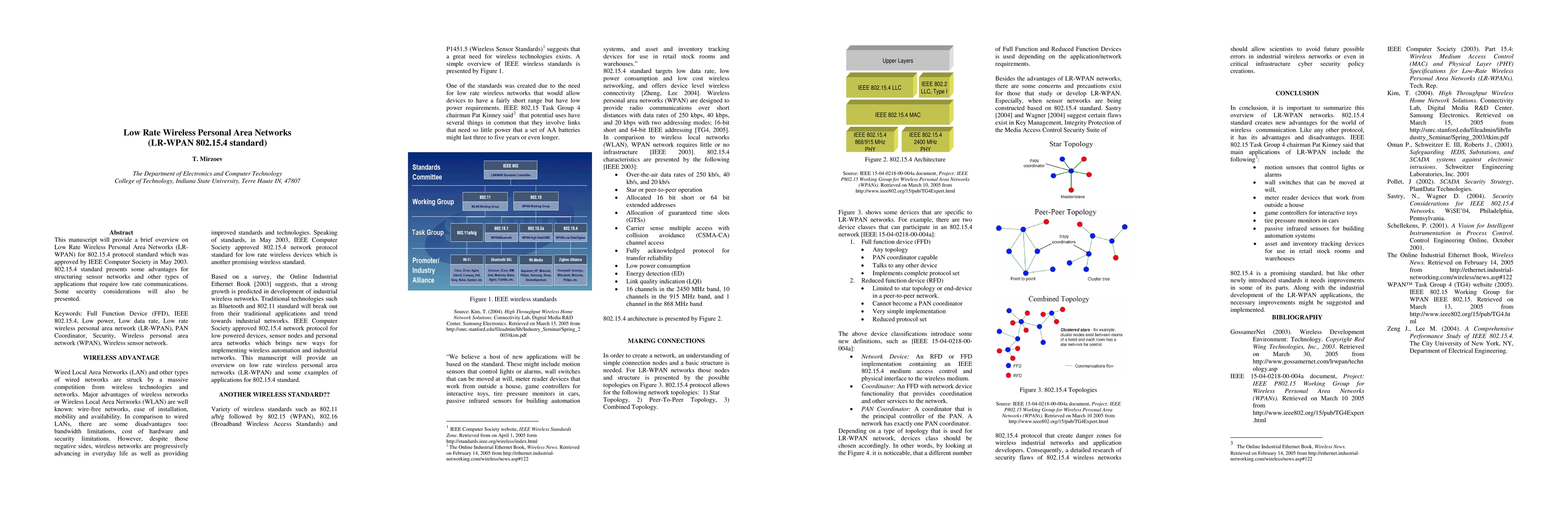 This manuscript will provide a brief overview on Low Rate Wireless Personal Area Networks (LR-WPAN) for 802.15.4 protocol standard which was approved by IEEE Computer Society in May 2003. 802.15.4 standard presents some advantages for structuring sensor networks and other types of applications that require low rate communications. Some security considerations will also be presented.