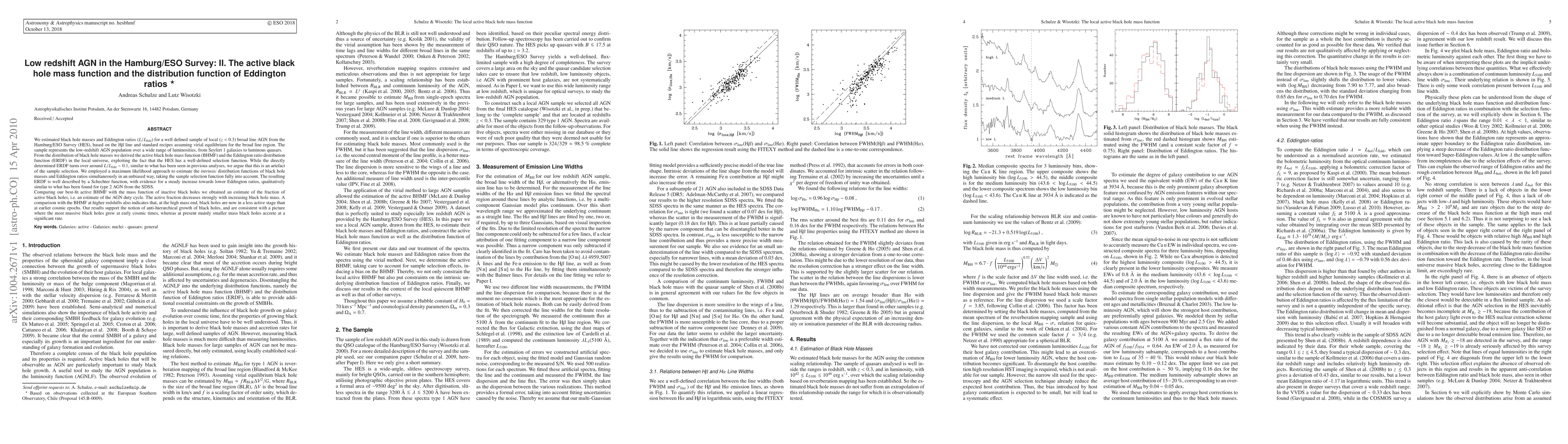 Researchers studied a sample of local active galactic nuclei (AGN) to estimate black hole masses and Eddington ratios, finding that the most massive black holes grew early and are less active now, while smaller ones accrete at higher rates.
