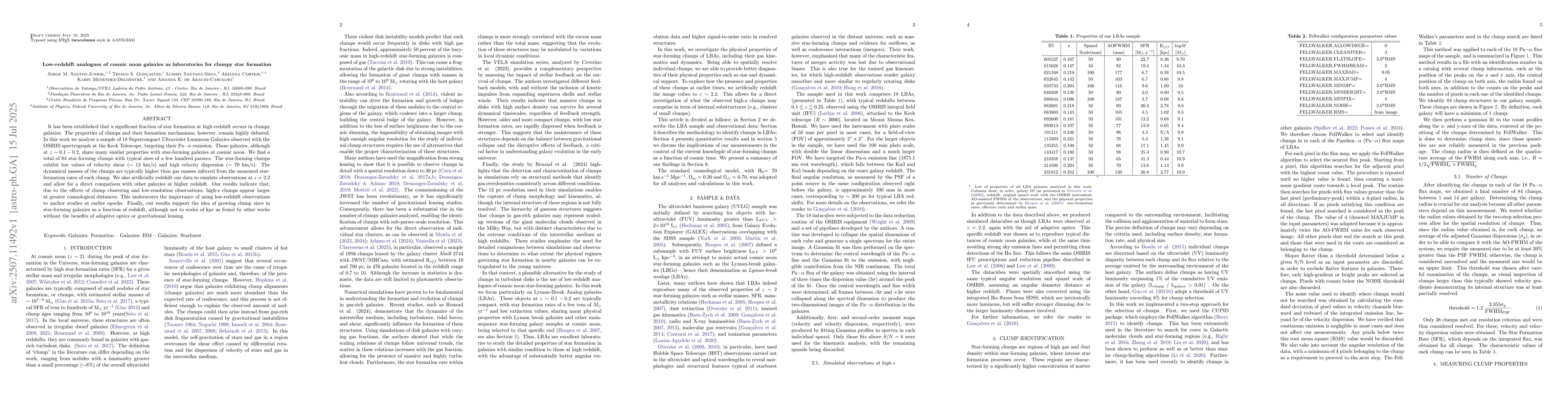 It has been established that a significant fraction of star formation at high-redshift occurs in clumpy galaxies. The properties of clumps and their formation mechanisms, however, remain highly debated. In this work we analyze a sample of 18 Supercompact Ultraviolet Luminous Galaxies observed with the OSIRIS spectrograph at the Keck Telescope, targeting their Pa-alpha emission. These galaxies, although at z~0.1-0.2, share many similar properties with star-forming galaxies at cosmic noon. We find a total of 84 star-forming clumps with typical sizes of a few hundred parsecs. The star-forming clumps exhibit low values of velocity shear (~12 km/s) and high velocity dispersion (~70 km/s). The dynamical masses of the clumps are typically higher than gas masses inferred from the measured star-formation rates of each clump. We also artificially redshift our data to emulate observations at z=2.2 and allow for a direct comparison with other galaxies at higher redshift. Our results indicate that, due to the effects of clump clustering and low-resolution observations, high-z clumps appear larger at greater cosmological distances. This underscores the importance of using low-redshift observations to anchor studies at earlier epochs. Finally, our results support the idea of growing clump sizes in star-forming galaxies as a function of redshift, although not to scales of kpc as found by other works without the benefits of adaptive optics or gravitational lensing.