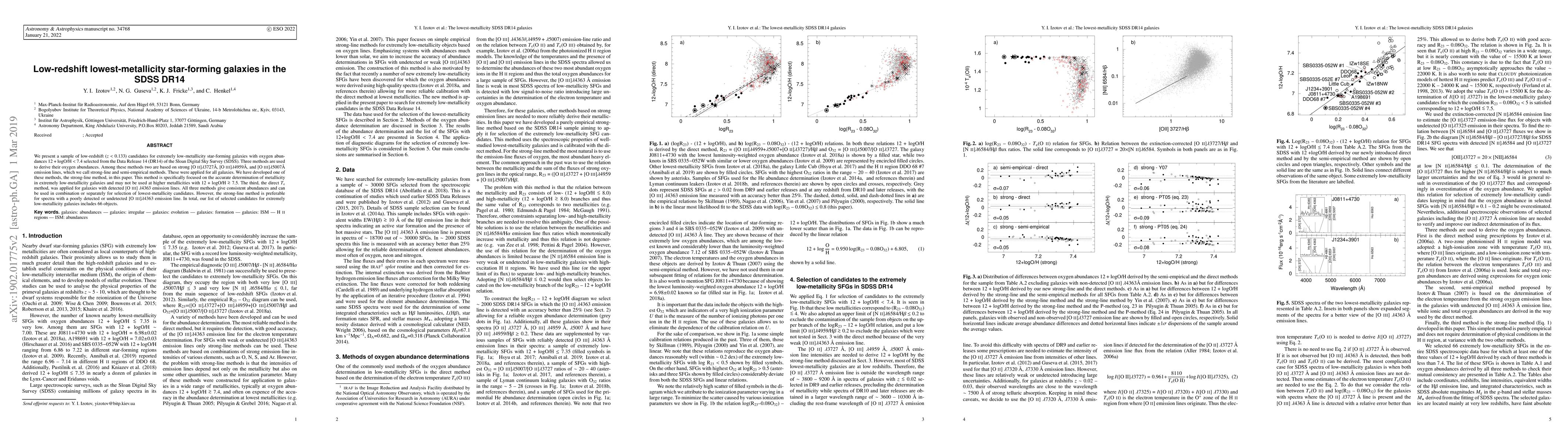 This paper identifies a sample of low-redshift star-forming galaxies with extremely low metallicities (12+logO/H<7.4) using three methods: strong-line, semi-empirical, and direct Te methods. The strong-line method, newly developed for this study, is particularly effective for low-metallicity galaxies. The research concludes with a list of 66 candidates selected from the SDSS DR14.