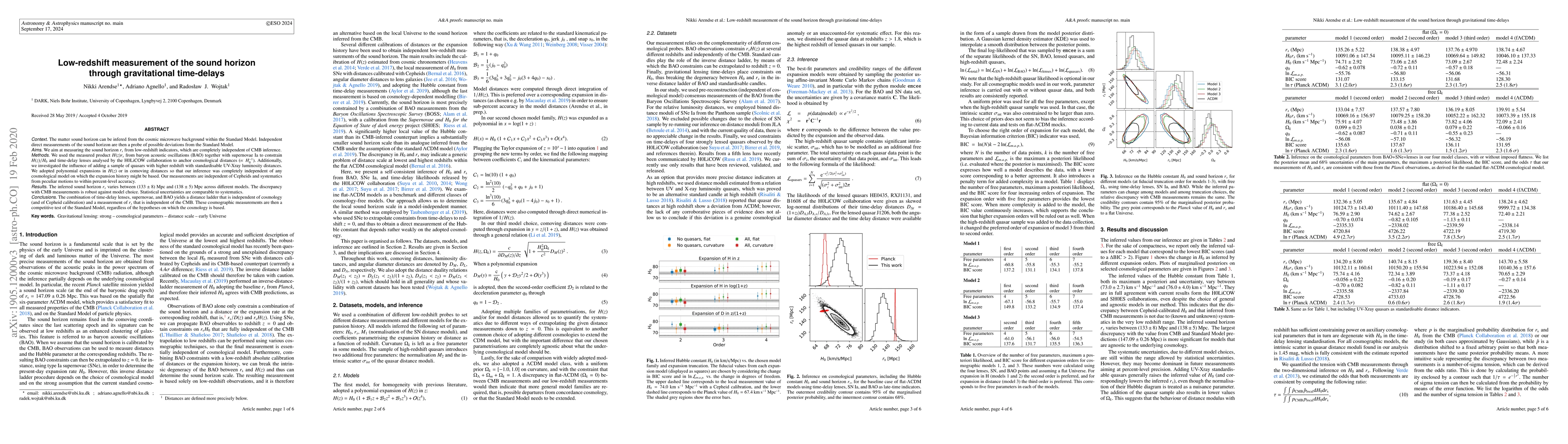 The matter sound horizon can be inferred from the cosmic microwave background within the Standard Model. Independent direct measurements of the sound horizon are then a probe of possible deviations from the Standard Model. We aim at measuring the sound horizon $r_s$ from low-redshift indicators, which are completely independent of CMB inference. We used the measured product $H(z)r_s$ from baryon acoustic oscillations (BAO) together with supernovae~\textsc{I}a to constrain $H(z)/H_{0}$ and time-delay lenses analysed by the H0LiCOW collaboration to anchor cosmological distances ($\propto H_{0}^{-1}$). {Additionally, we investigated the influence of adding a sample of quasars with higher redshift with standardisable UV-Xray luminosity distances. We adopted polynomial expansions in $H(z)$ or in comoving distances} so that our inference was completely independent of any cosmological model on which the expansion history might be based. Our measurements are independent of Cepheids and systematics from peculiar motions {to within percent-level accuracy.} The inferred sound horizon $r_s$ varies between $(133 \pm 8)$~Mpc and $(138 \pm 5)$~Mpc across different models. The discrepancy with CMB measurements is robust against model choice. Statistical uncertainties are comparable to systematics. The combination of time-delay lenses, supernovae, and BAO yields a distance ladder that is independent of cosmology (and of Cepheid calibration) and a measurement of $r_s $ that is independent of the CMB. These cosmographic measurements are then a competitive test of the Standard Model, regardless of the hypotheses on which the cosmology is based.