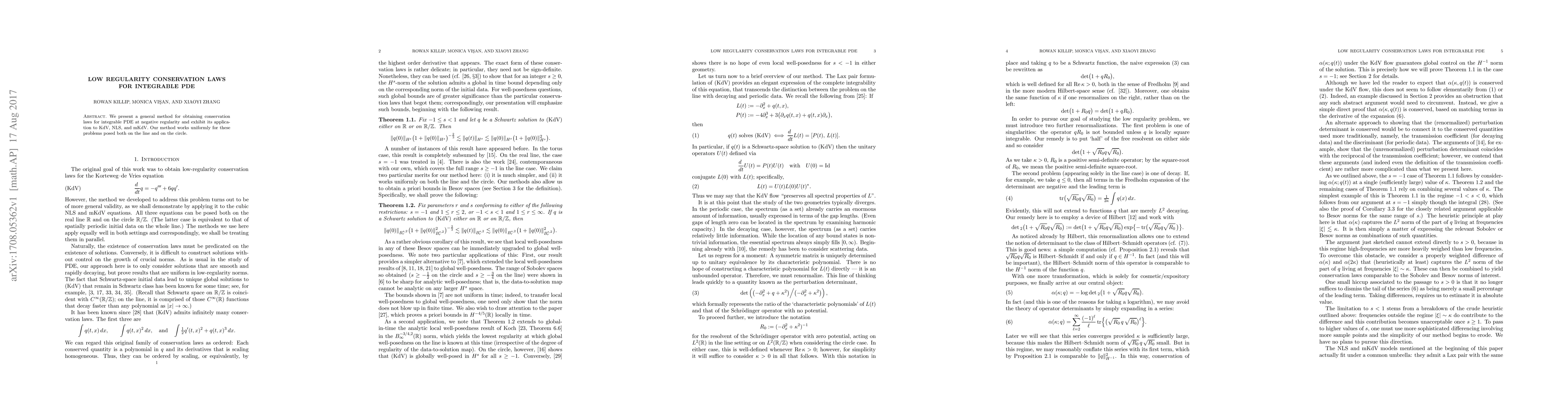 This paper introduces a novel technique for deriving conservation laws for integrable partial differential equations (PDE) at negative regularity levels, demonstrating its effectiveness across KdV, NLS, and mKdV equations, applicable both on the line and the circle.