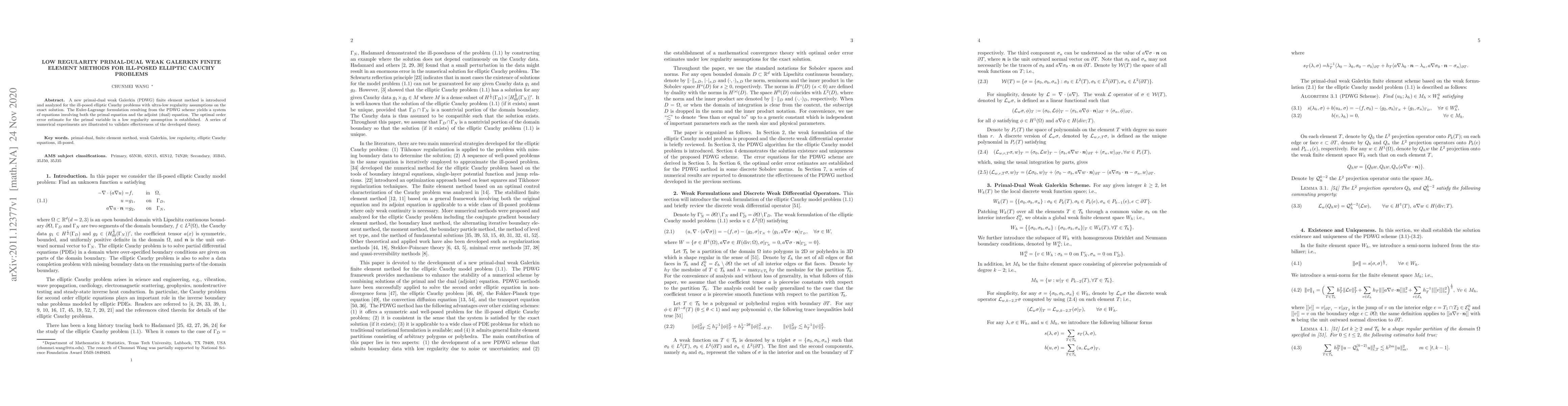 The paper introduces a novel primal-dual weak Galerkin finite element method to solve ill-posed elliptic Cauchy problems under ultra-low regularity assumptions. It establishes optimal error estimates and validates the method through numerical experiments.