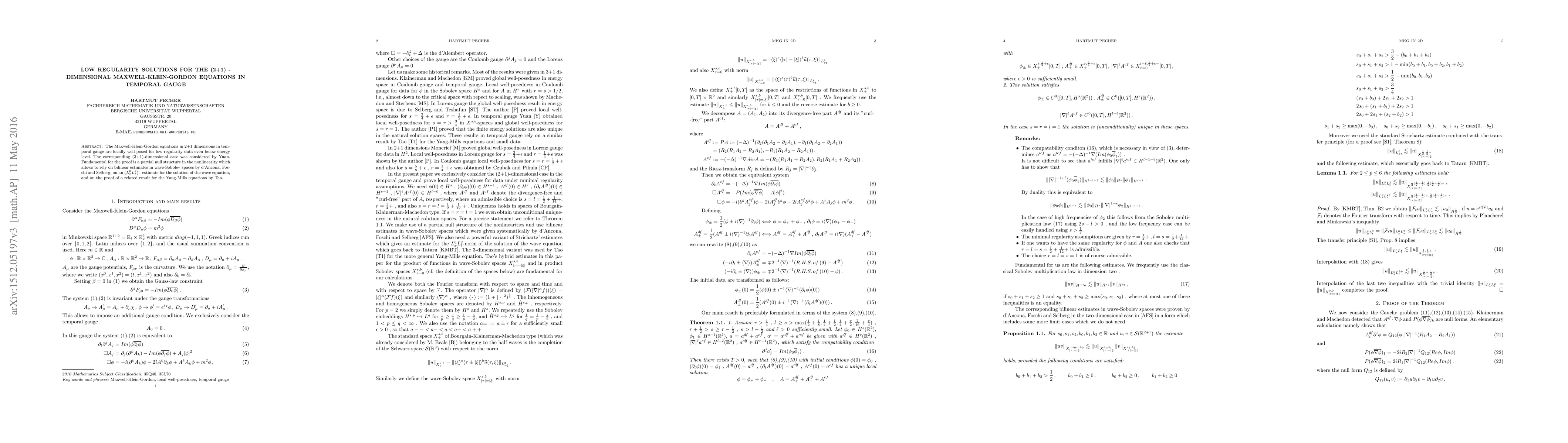 The Maxwell-Klein-Gordon equations in 2+1 dimensions in temporal gauge are locally well-posed for low regularity data even below energy level. The corresponding (3+1)-dimensional case was considered by Yuan. Fundamental for the proof is a partial null structure in the nonlinearity which allows to rely on bilinear estimates in wave-Sobolev spaces by d'Ancona, Foschi and Selberg, on an $(L^p_x L^q_t)$ - estimate for the solution of the wave equation, and on the proof of a related result for the Yang-Mills equations by Tao.