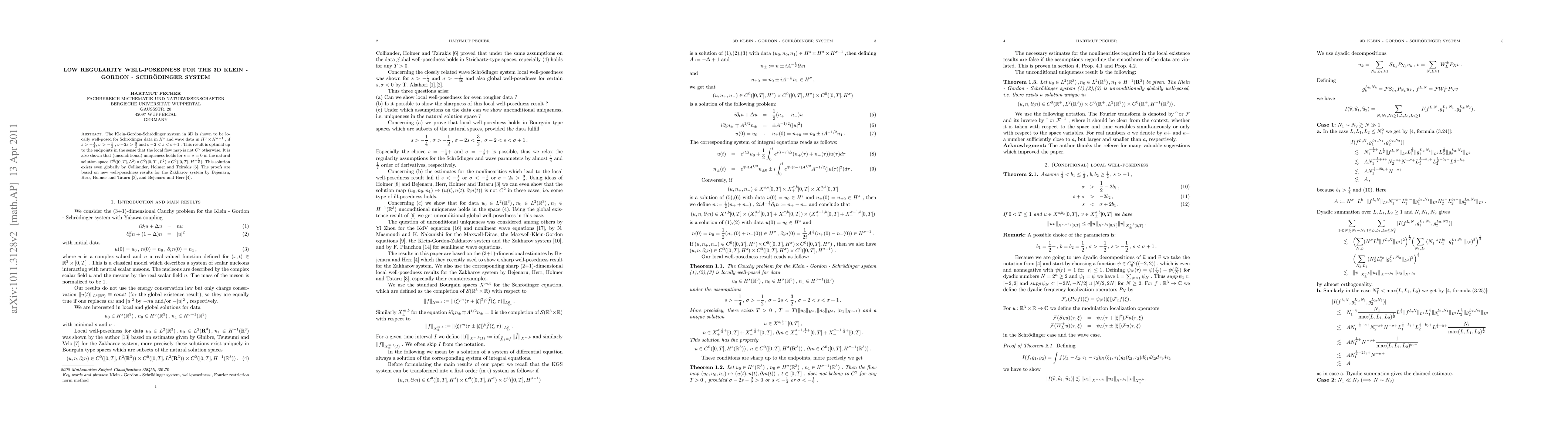 The paper establishes local well-posedness for the 3D Klein-Gordon-Schr\"odinger system under specific regularity conditions for Schrödinger and wave data, proving optimality and uniqueness for s=σ=0. The proofs leverage new results for the Zakharov system.
