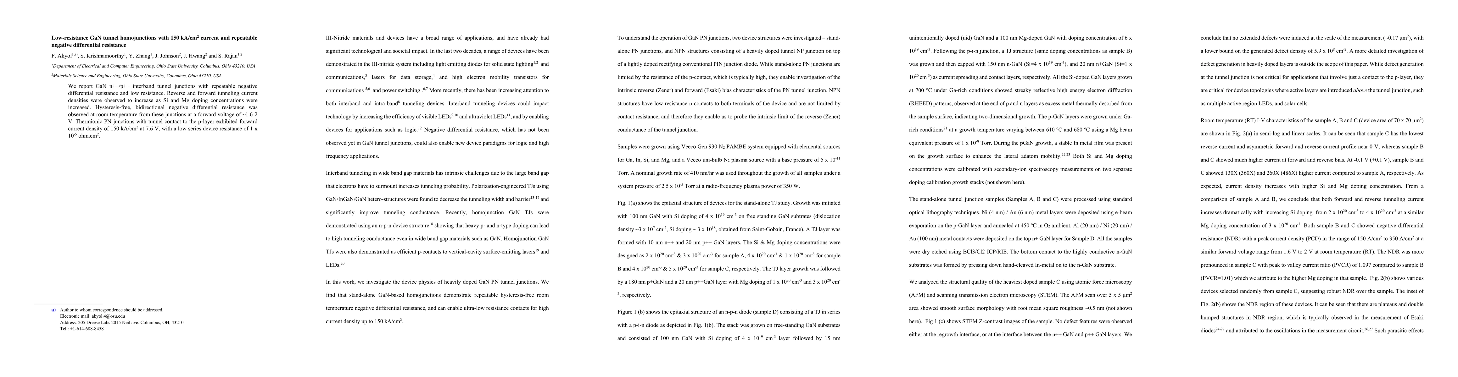 This paper reports on GaN tunnel homojunctions that exhibit low resistance and high current density, achieving 150 kA/cm^2 at 7.6 V, alongside repeatable negative differential resistance at room temperature. The junctions show hysteresis-free, bidirectional negative differential resistance due to increased Si and Mg doping.