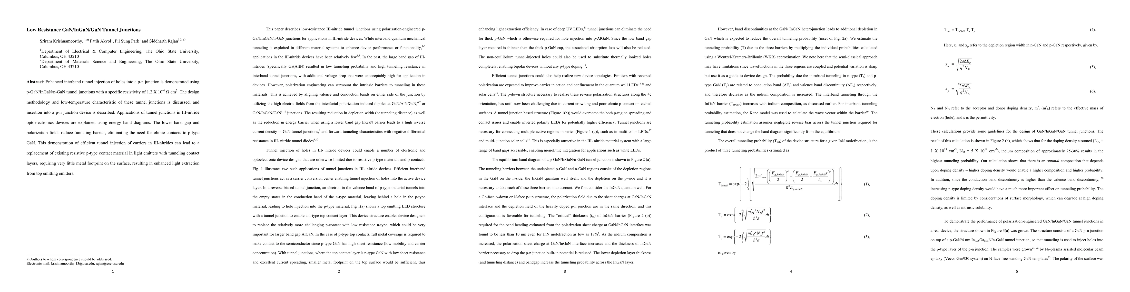 This paper demonstrates P-GaN/InGaN/N-GaN tunnel junctions with low resistivity for efficient interband tunnel injection, potentially replacing resistive p-type contacts in III-nitride optoelectronics to enhance light extraction with minimal metal footprint. Applications in optoelectronic devices are highlighted through the reduction of tunneling barriers via lower band gaps and polarization fields.