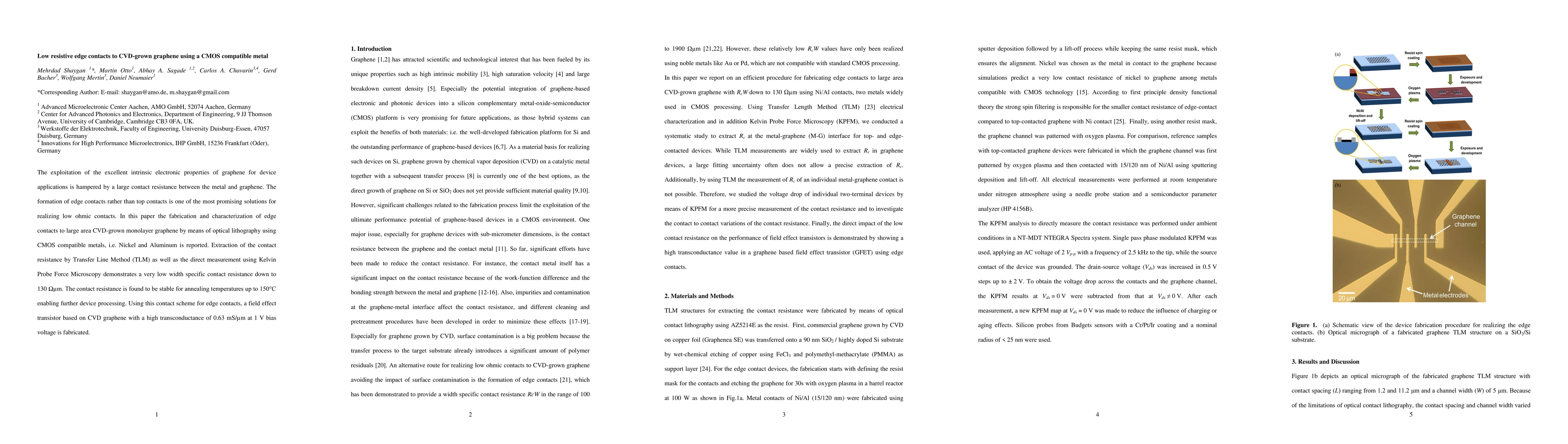 This paper reports the fabrication of low resistive edge contacts to CVD-grown graphene using CMOS compatible metals like Nickel and Aluminum, achieving significantly reduced contact resistance through optical lithography. The contact resistance is confirmed by Transfer Line Method and Kelvin Probe Force Microscopy.