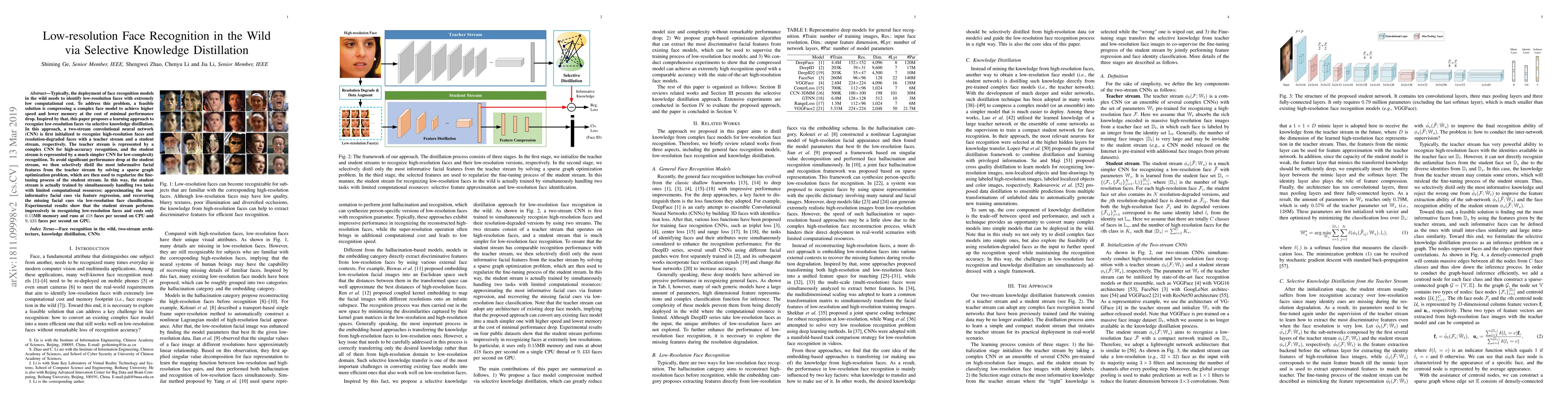 This paper proposes a selective knowledge distillation method to recognize low-resolution faces efficiently using a two-stream CNN, balancing high accuracy and low computational cost. The student stream, trained with distilled informative features from the teacher stream, achieves impressive recognition performance while using minimal memory and processing speed.