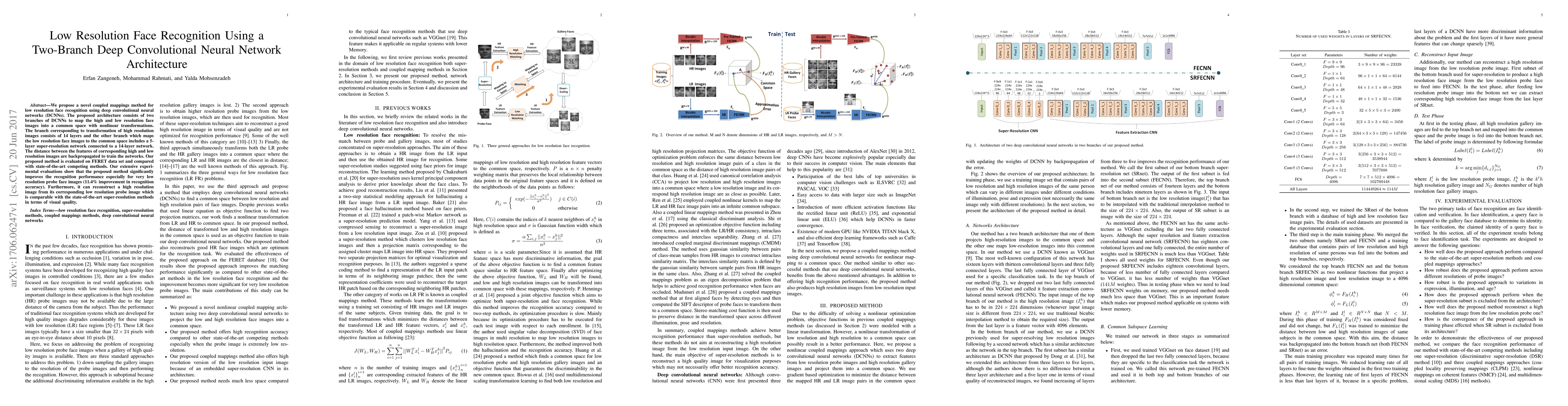 This paper proposes a two-branch deep convolutional neural network for low resolution face recognition, achieving significant improvements over competing methods. The architecture includes a 14-layer network for high resolution and a 5-layer super-resolution network followed by a 14-layer network for low resolution, showing a 11.4% accuracy boost and comparable super-resolution quality.