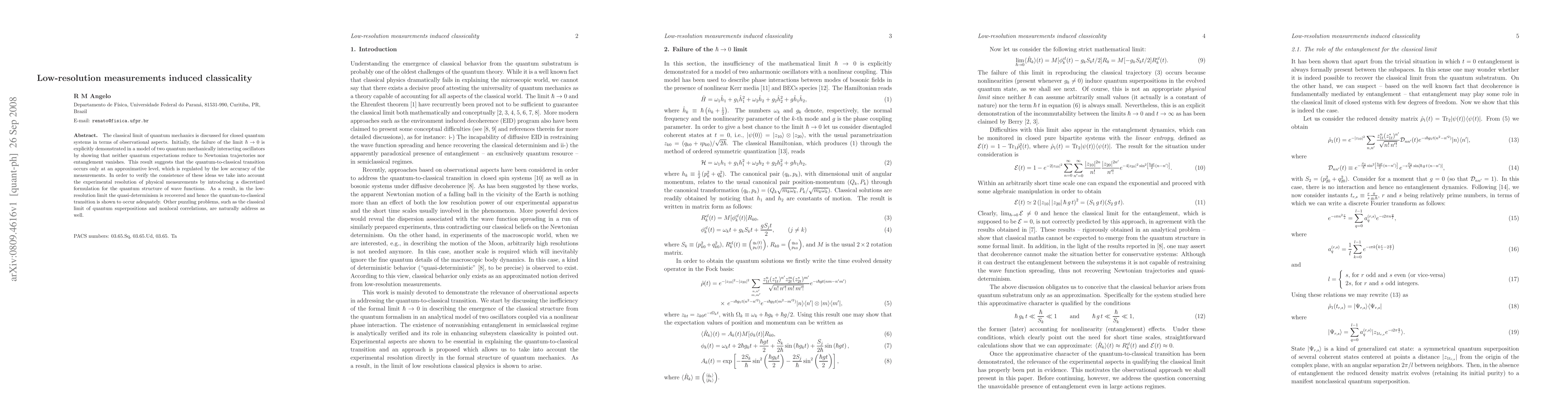 The classical limit of quantum mechanics is discussed for closed quantum systems in terms of observational aspects. Initially, the failure of the limit h->0 is explicitly demonstrated in a model of two quantum mechanically interacting oscillators by showing that neither quantum expectations reduce to Newtonian trajectories nor entanglement vanishes. This result suggests that the quantum-to-classical transition occurs only at an approximative level, which is regulated by the low accuracy of the measurements. In order to verify the consistence of these ideas we take into account the experimental resolution of physical measurements by introducing a discretized formulation for the quantum structure of wave functions. As a result, in the low-resolution limit the quasi-determinism is recovered and hence the quantum-to-classical transition is shown to occur adequately. Other puzzling problems, such as the classical limit of quantum superpositions and nonlocal correlations, are naturally address as well.