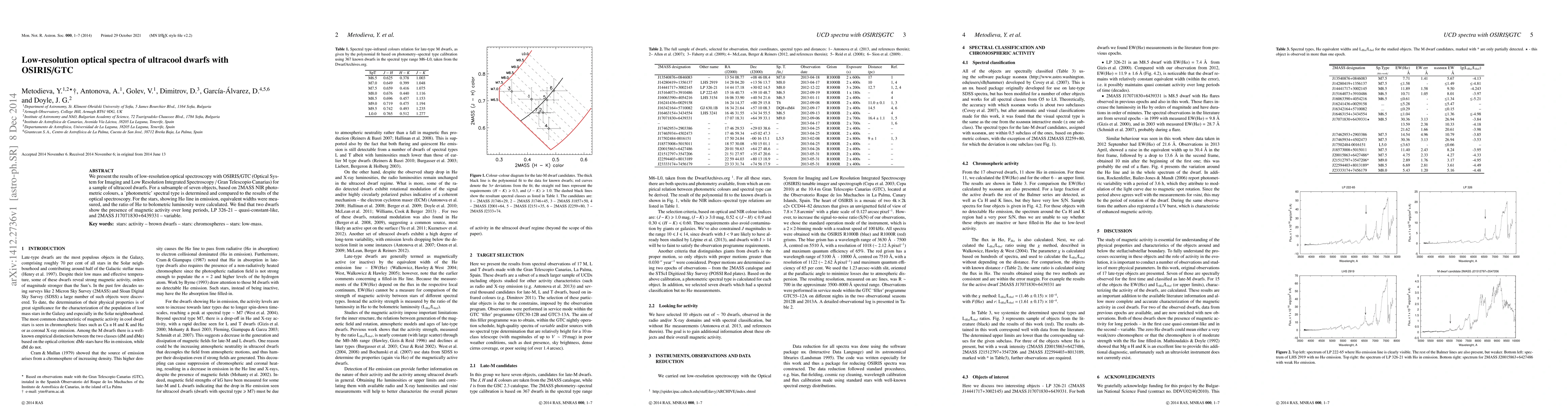 We present the results of low-resolution optical spectroscopy with OSIRIS/GTC (Optical System for Imaging and Low Resolution Integrated Spectroscopy / Gran Telescopio Canarias) for a sample of ultracool dwarfs. For a subsample of seven objects, based on 2MASS NIR photometric colours, a 'photometric' spectral type is determined and compared to the results of the optical spectroscopy. For the stars, showing H$\alpha$ line in emission, equivalent widths were measured, and the ratio of H$\alpha$ to bolometric luminosity were calculated. We find that two dwarfs show the presence of magnetic activity over long periods, LP 326-21 -- quasi-constant-like, and 2MASS J17071830+6439331 -- variable.