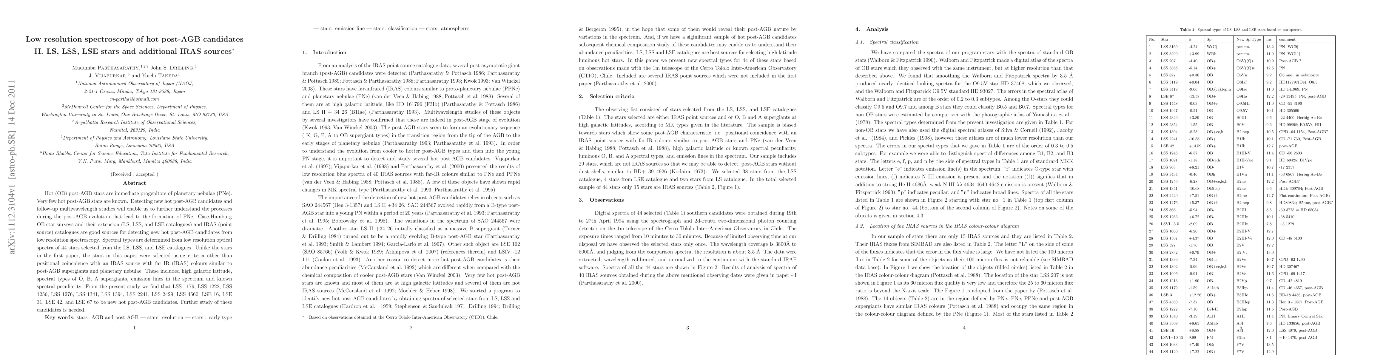Hot (OB) post-AGB stars are immediate progenitors of planetary nebulae (PNe). Very few hot post-AGB stars are known. Detecting new hot post-AGB candidates and follow-up multiwavelength studies will enable us to further understand the processes during the post-AGB evolution that lead to the formation of PNe. Case-Hamburg OB star surveys and their extension (LS, LSS, and LSE catalogues) and IRAS (point source) catalogues are good sources for detecting new hot post-AGB candidates from low resolution spectroscopy. Spectral types are determined from low resolution optical spectra of 44 stars selected from the LS, LSS, and LSE catalogues. Unlike the stars in the first paper, the stars in this paper were selected using criteria other than positional coincidence with an IRAS source with far IR (IRAS) colours similar to post-AGB supergiants and planetary nebulae. These included high galactic latitude, spectral types of O, B, A supergiants, emission lines in the spectrum and known spectral peculiarity. From the present study we find that LSS 1179, LSS 1222, LSS 1256, LSS 1276, LSS 1341, LSS 1394, LSS 2241, LSS 2429, LSS 4560, LSE 16, LSE 31, LSE 42, and LSE 67 to be new hot post-AGB candidates. Further study of these candidates is needed.