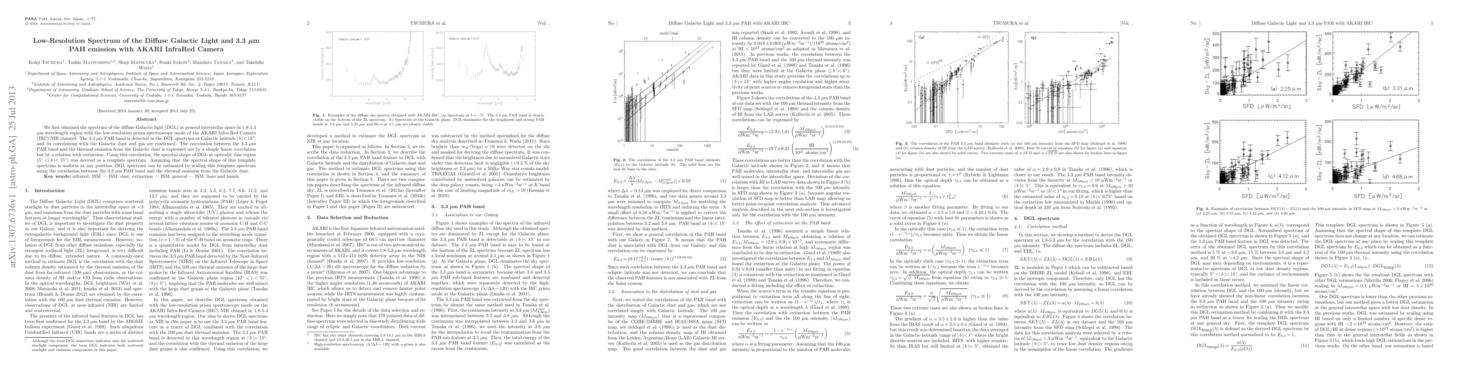 This study obtained the low-resolution spectrum of the diffuse Galactic light (DGL) using the AKARI Infra-Red Camera, detecting a 3.3 um PAH band correlated with Galactic dust and gas. The derived template spectrum for DGL allows estimation of its spectrum by scaling based on the PAH band's correlation with thermal dust emission.