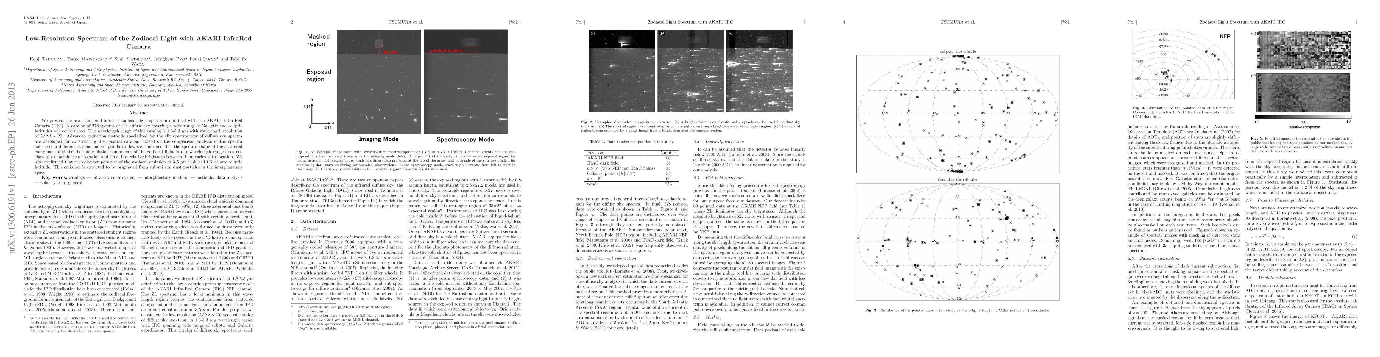 This study presents the near- and mid-infrared spectrum of the zodiacal light obtained using the AKARI InfraRed Camera, revealing a catalog of 278 spectra across various Galactic and ecliptic latitudes. The analysis confirms that the spectral shape of the zodiacal light is location-independent but its relative brightness varies with location, with a consistent color temperature of 300±10 K.