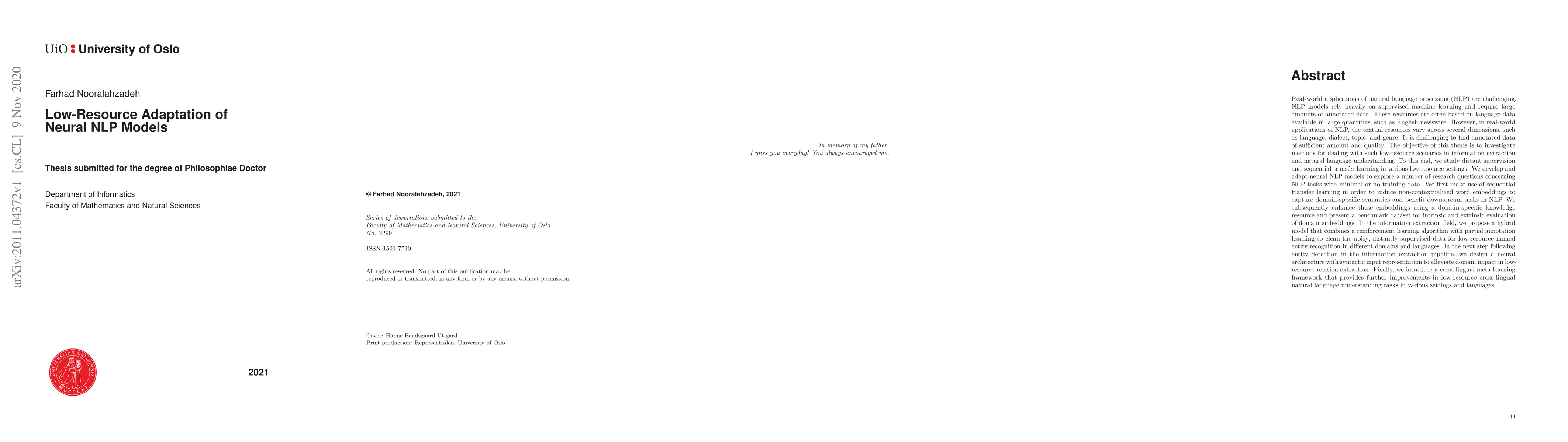 This paper investigates methods for adapting neural NLP models to low-resource scenarios, focusing on information extraction and natural language understanding. It explores distant supervision and sequential transfer learning to address the challenge of limited annotated data in various dimensions like language, dialect, topic, and genre.