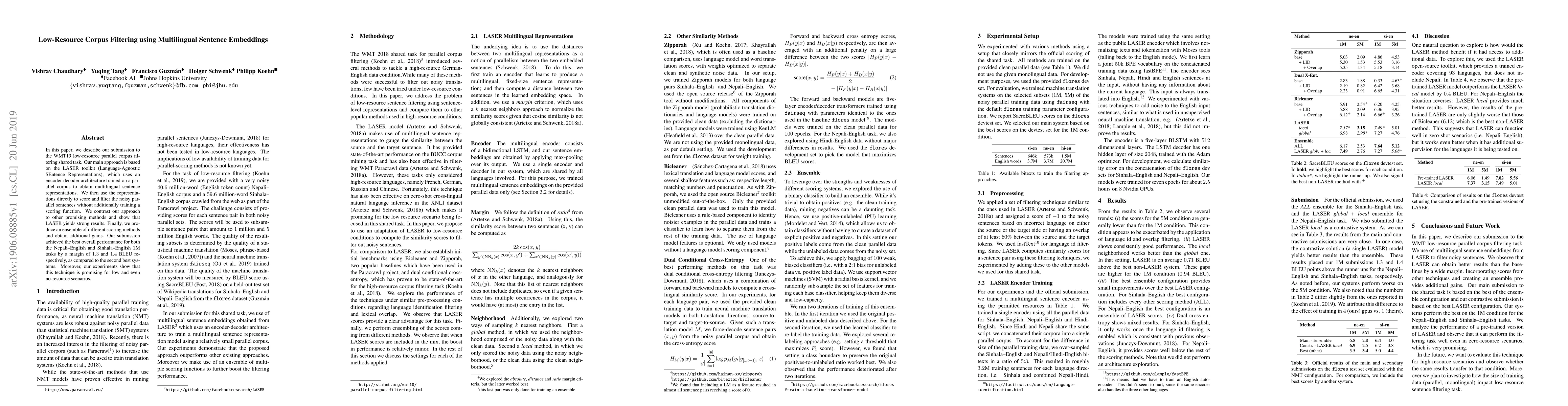 This research paper presents a method for low-resource corpus filtering using multilingual sentence embeddings, achieving state-of-the-art results in Nepali-English and Sinhala-English 1M tasks with significant gains from ensemble methods.