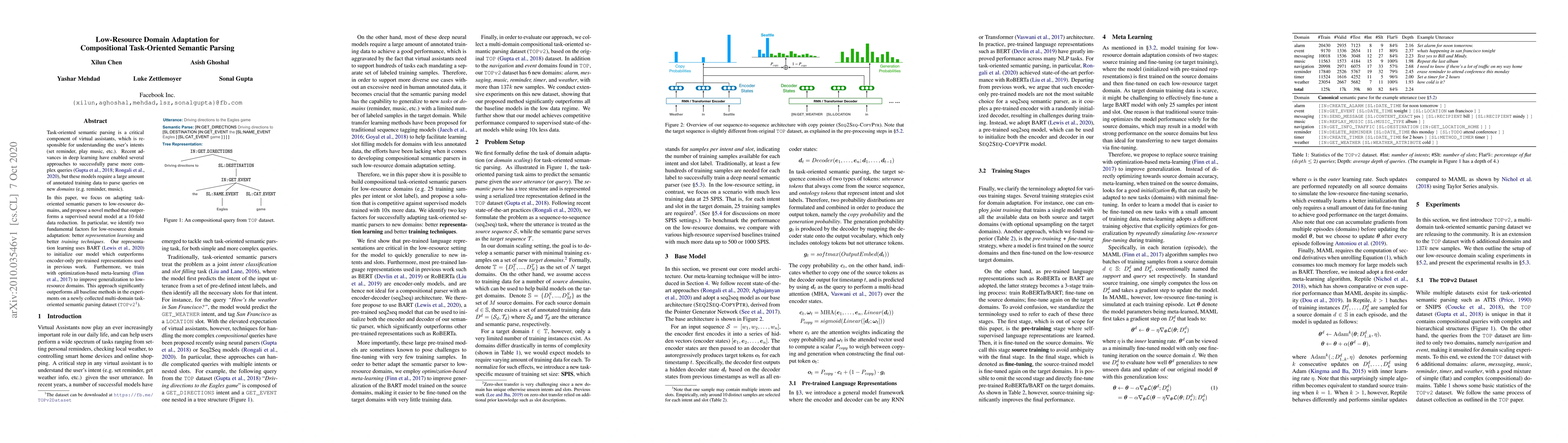 This paper proposes a novel method for low-resource domain adaptation in task-oriented semantic parsing, achieving better performance with 10-fold less training data. It uses BART for representation learning and optimization-based meta-learning for improved generalization, outperforming previous methods on a new multi-domain dataset.