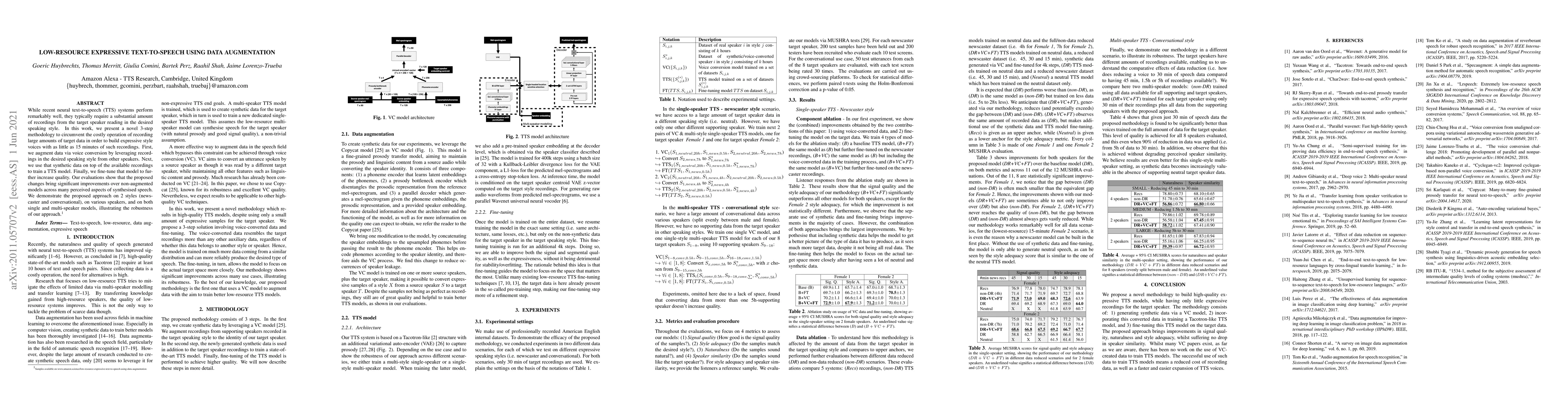 While recent neural text-to-speech (TTS) systems perform remarkably well, they typically require a substantial amount of recordings from the target speaker reading in the desired speaking style. In this work, we present a novel 3-step methodology to circumvent the costly operation of recording large amounts of target data in order to build expressive style voices with as little as 15 minutes of such recordings. First, we augment data via voice conversion by leveraging recordings in the desired speaking style from other speakers. Next, we use that synthetic data on top of the available recordings to train a TTS model. Finally, we fine-tune that model to further increase quality. Our evaluations show that the proposed changes bring significant improvements over non-augmented models across many perceived aspects of synthesised speech. We demonstrate the proposed approach on 2 styles (newscaster and conversational), on various speakers, and on both single and multi-speaker models, illustrating the robustness of our approach.