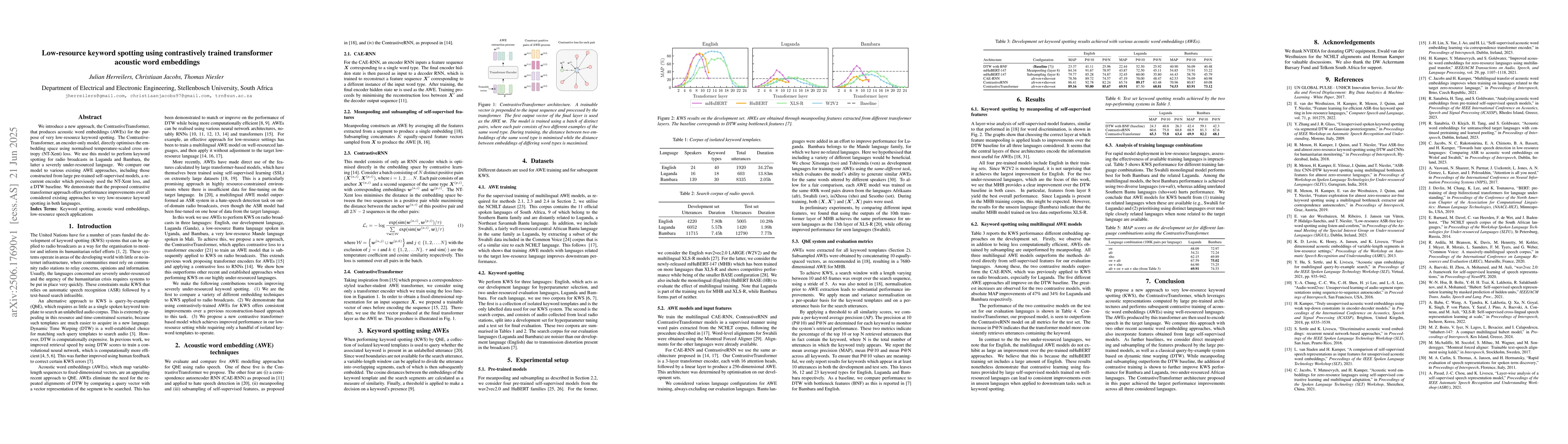 We introduce a new approach, the ContrastiveTransformer, that produces acoustic word embeddings (AWEs) for the purpose of very low-resource keyword spotting. The ContrastiveTransformer, an encoder-only model, directly optimises the embedding space using normalised temperature-scaled cross entropy (NT-Xent) loss. We use this model to perform keyword spotting for radio broadcasts in Luganda and Bambara, the latter a severely under-resourced language. We compare our model to various existing AWE approaches, including those constructed from large pre-trained self-supervised models, a recurrent encoder which previously used the NT-Xent loss, and a DTW baseline. We demonstrate that the proposed contrastive transformer approach offers performance improvements over all considered existing approaches to very low-resource keyword spotting in both languages.