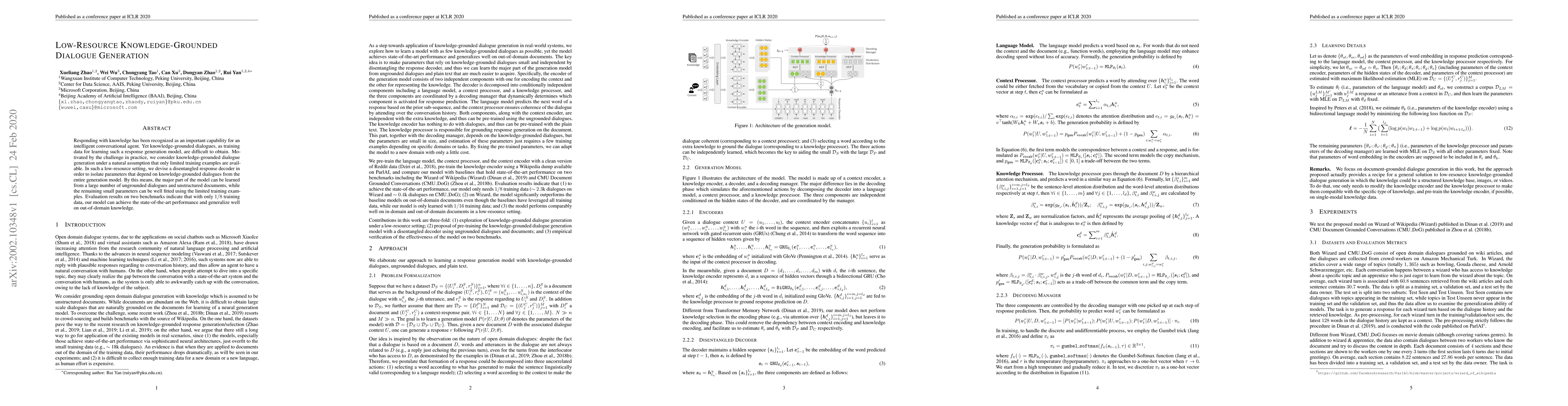 This paper proposes a low-resource knowledge-grounded dialogue generation model using a disentangled response decoder. It allows the majority of the model to be trained on large datasets of ungrounded dialogues, while the remaining parameters are fine-tuned with limited knowledge-grounded examples, achieving state-of-the-art performance.
