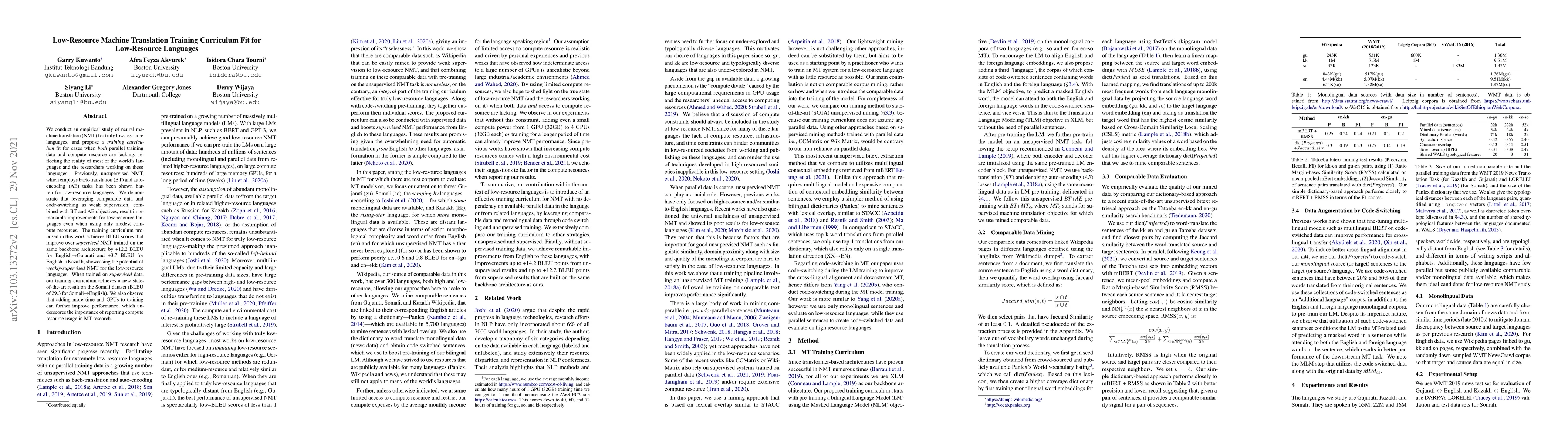 We conduct an empirical study of neural machine translation (NMT) for truly low-resource languages, and propose a training curriculum fit for cases when both parallel training data and compute resource are lacking, reflecting the reality of most of the world's languages and the researchers working on these languages. Previously, unsupervised NMT, which employs back-translation (BT) and auto-encoding (AE) tasks has been shown barren for low-resource languages. We demonstrate that leveraging comparable data and code-switching as weak supervision, combined with BT and AE objectives, result in remarkable improvements for low-resource languages even when using only modest compute resources. The training curriculum proposed in this work achieves BLEU scores that improve over supervised NMT trained on the same backbone architecture by +12.2 BLEU for English to Gujarati and +3.7 BLEU for English to Kazakh, showcasing the potential of weakly-supervised NMT for the low-resource languages. When trained on supervised data, our training curriculum achieves a new state-of-the-art result on the Somali dataset (BLEU of 29.3 for Somali to English). We also observe that adding more time and GPUs to training can further improve performance, which underscores the importance of reporting compute resource usage in MT research.