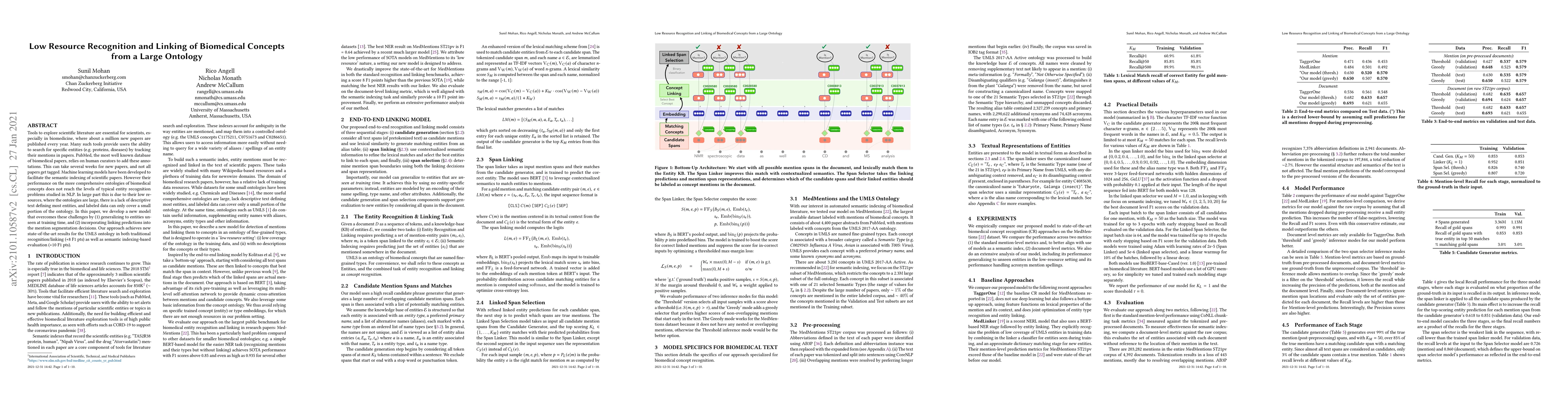 This paper presents a novel machine learning model for recognizing and linking biomedical concepts from a large ontology, addressing low-resource challenges. The model achieves state-of-the-art results in both traditional and semantic indexing evaluations for the UMLS ontology.