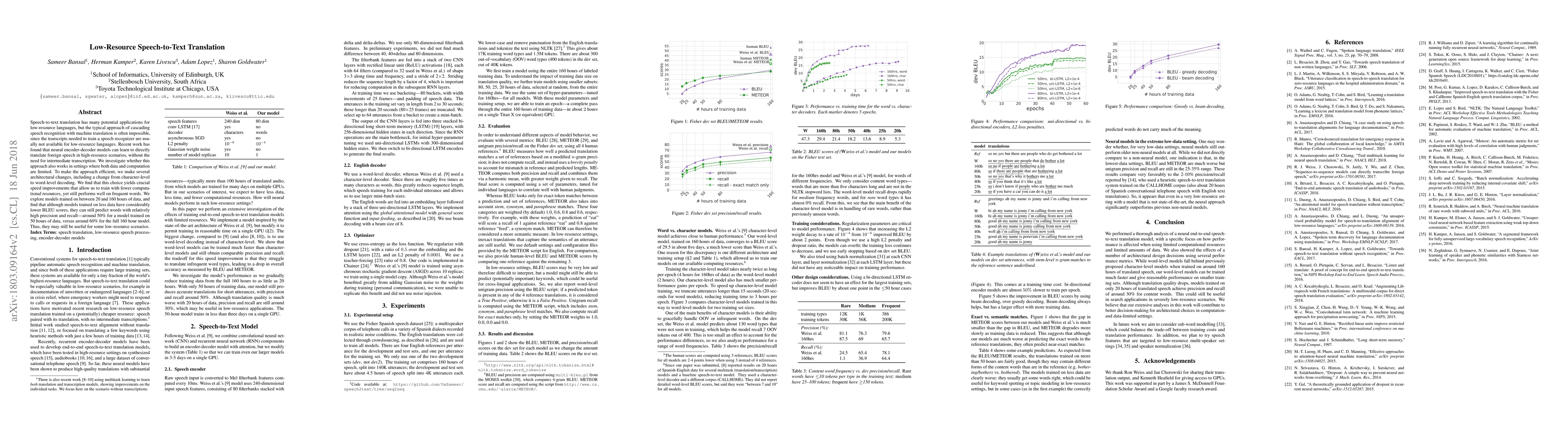 This paper explores neural encoder-decoder models for direct speech-to-text translation in low-resource languages, bypassing the need for intermediate transcriptions. It finds that word-level decoding and architectural changes enable efficient training with limited data, achieving around 50% precision and recall for models trained on 50 hours of data.