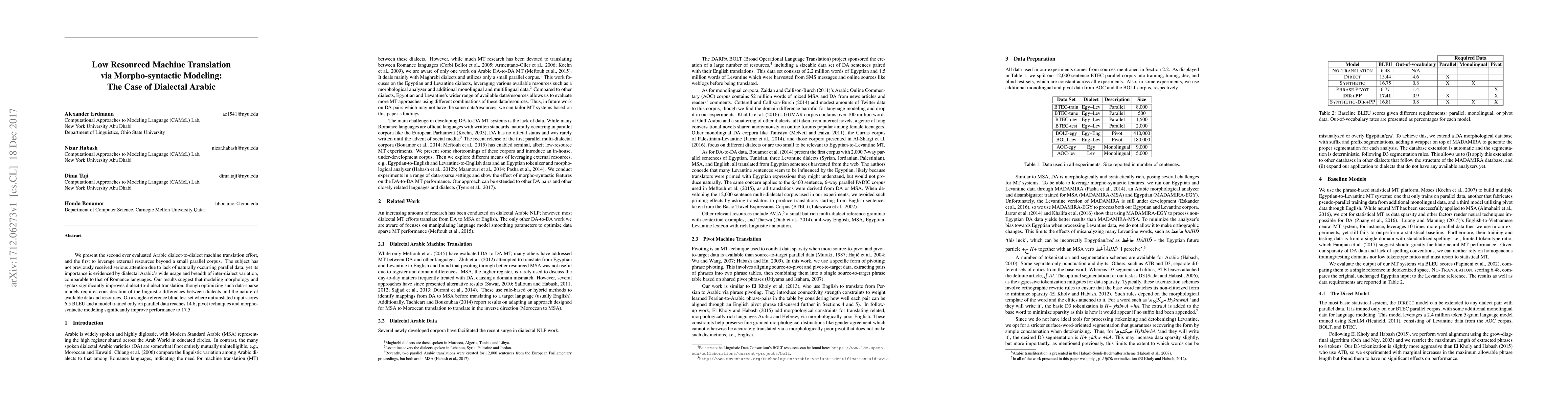 The paper presents a dialect-to-dialect machine translation effort for Dialectal Arabic, utilizing morpho-syntactic modeling and external resources beyond a small parallel corpus.