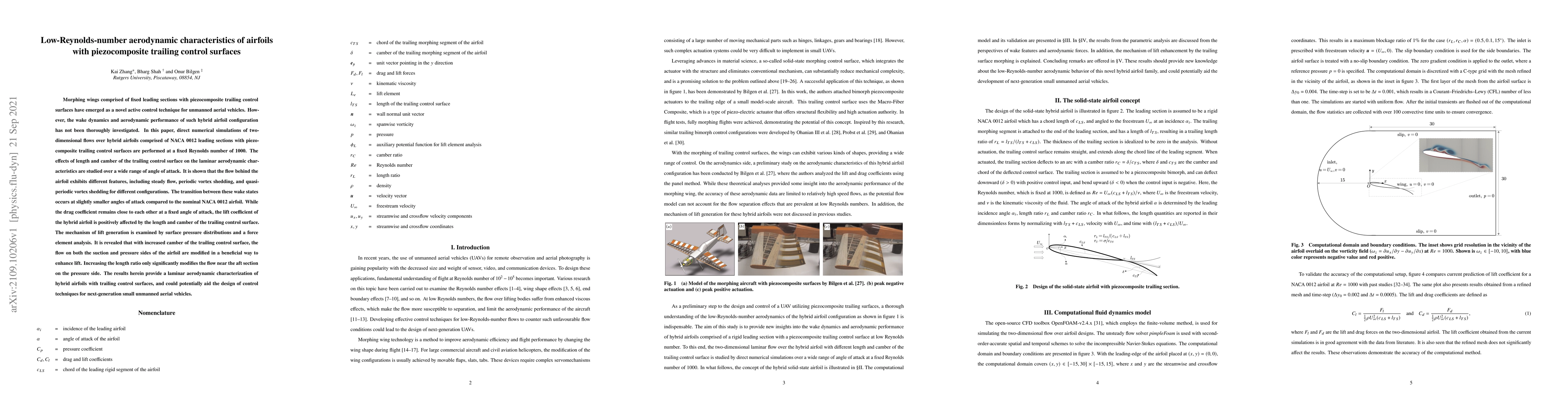 This paper investigates the aerodynamic characteristics of hybrid airfoils with piezocomposite trailing control surfaces using direct numerical simulations at a low Reynolds number of 1000. The study shows that varying the length and camber of the trailing control surfaces significantly affects lift while maintaining similar drag, providing insights for designing next-generation small unmanned aerial vehicles.