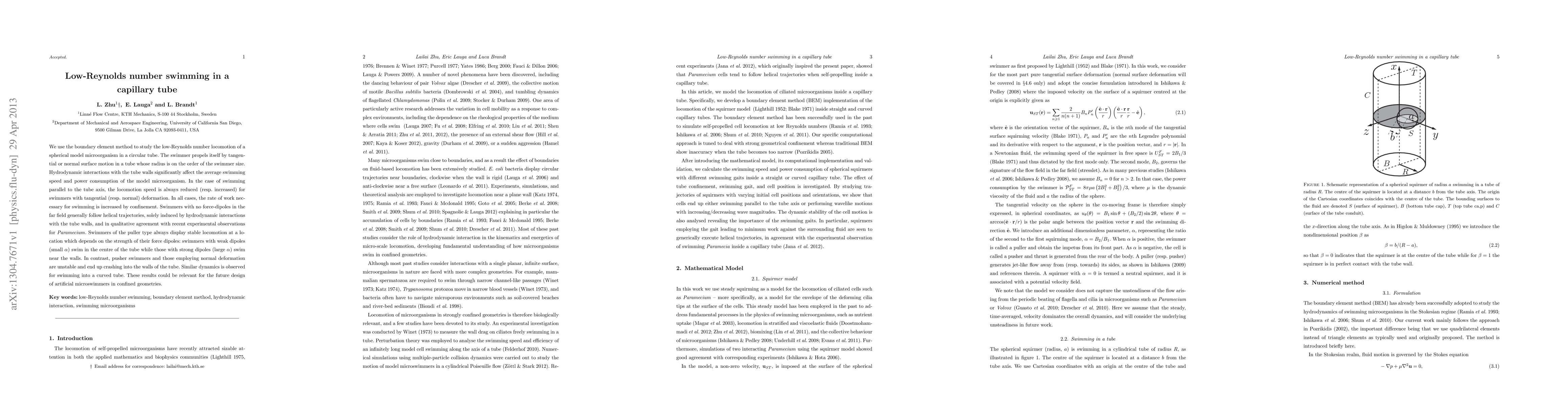 We use the boundary element method to study the low-Reynolds number locomotion of a spherical model microorganism in a circular tube. The swimmer propels itself by tangen- tial or normal surface motion in a tube whose radius is on the order of the swimmer size. Hydrodynamic interactions with the tube walls significantly affect the average swimming speed and power consumption of the model microorganism. In the case of swimming parallel to the tube axis, the locomotion speed is always reduced (resp. increased) for swimmers with tangential (resp. normal) deformation. In all cases, the rate of work nec- essary for swimming is increased by confinement. Swimmers with no force-dipoles in the far field generally follow helical trajectories, solely induced by hydrodynamic interactions with the tube walls, and in qualitative agreement with recent experimental observations for Paramecium. Swimmers of the puller type always display stable locomotion at a lo- cation which depends on the strength of their force dipoles: swimmers with weak dipoles (small {\alpha}) swim in the centre of the tube while those with strong dipoles (large {\alpha}) swim near the walls. In contrast, pusher swimmers and those employing normal deformation are unstable and end up crashing into the walls of the tube. Similar dynamics is observed for swimming into a curved tube. These results could be relevant for the future design of artificial microswimmers in confined geometries.
