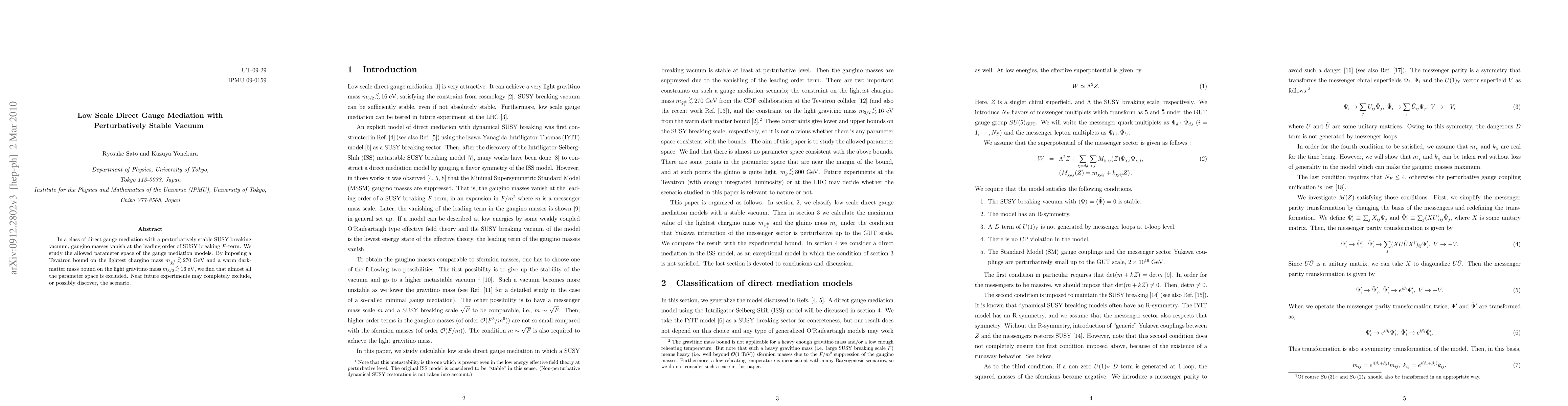 In a class of direct gauge mediation with a perturbatively stable SUSY breaking vacuum, gaugino masses vanish at the leading order of SUSY breaking F-term. We study the allowed parameter space of the gauge mediation models. By imposing a Tevatron bound on the lightest chargino mass m_{{\tilde \chi}^\pm_1} > 270 GeV and a warm dark-matter mass bound on the light gravitino mass m_{3/2} < 16 eV, we find that almost all the parameter space is excluded. Near future experiments may completely exclude, or possibly discover, the scenario.