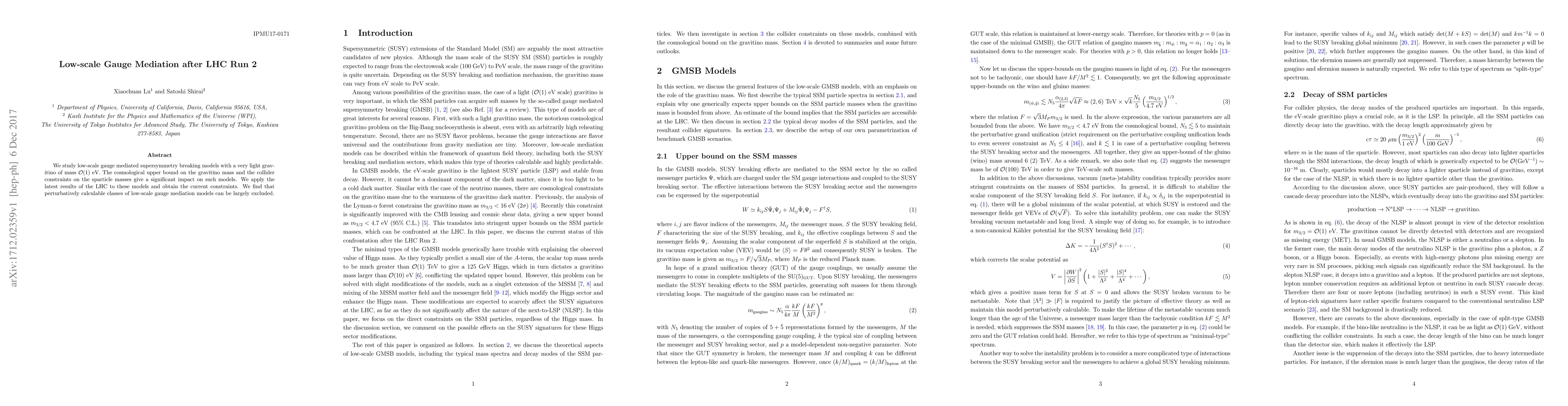 This paper examines low-scale gauge mediation models with a light gravitino, constrained by the latest LHC results and cosmological limits. It concludes that most perturbatively calculable classes of these models are now largely excluded due to collider constraints.